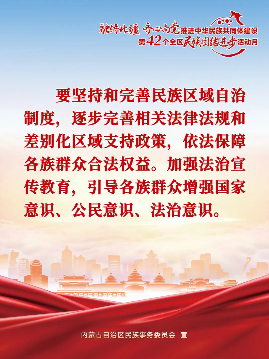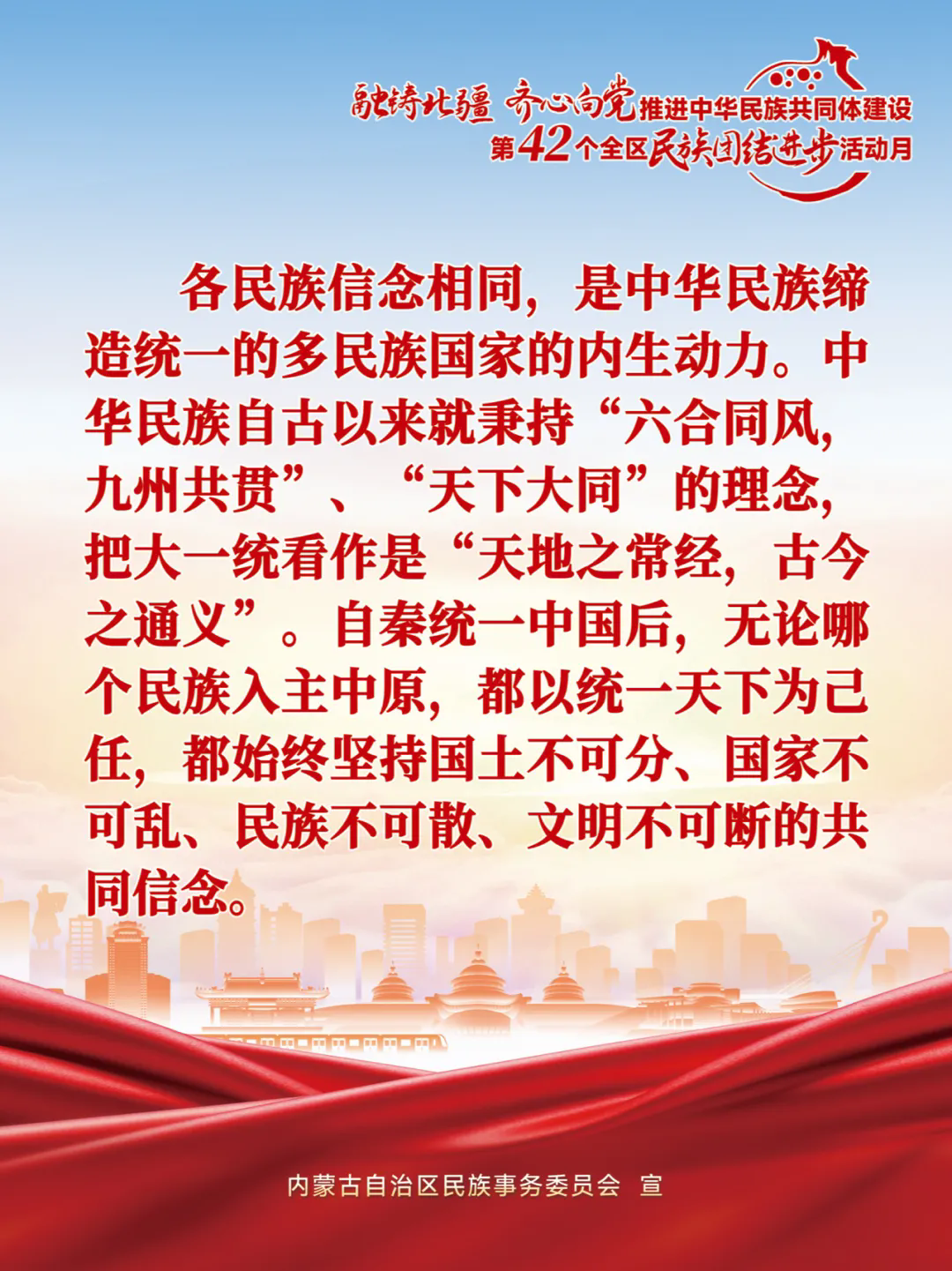 2025年9月是第42个全区民族团结进步活动月。为做好第42个全区民族团结进步活动月工作,深入学习宣传习近平总书记关于加强和改进民族工作的重要思想,生动讲好新时代内蒙古民族团结进步故事,自治区民委广泛征求民族团结进步主题素材、认真提炼总结民族团结进步故事,精心设计制作推出第42个全区民族团结进步活动月主题系列海报,现进行广泛推广和宣传,欢迎大家下载使用、积极转载,共同讲好新时代内蒙古推进中华民族共同体建设故事!