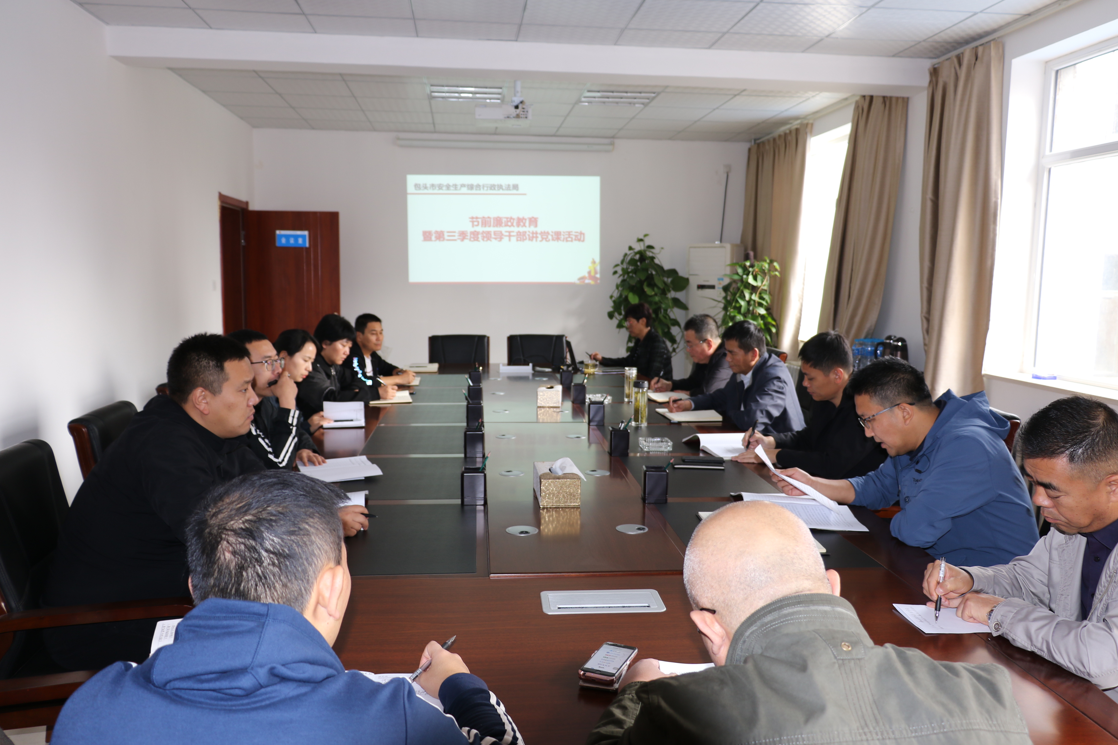 2020年国庆、中秋节日来临之际,为保证干部职工过一个安全、廉洁、愉快的节日,按照市纪委和市局党委有关工作要求,结合“三会一课”和廉政文化月活动安排,9月30日,执法局组织开展节前教育暨第三季度领导干部讲党课活动。市局党组成员刘从胜副调研员参加活动并讲话。