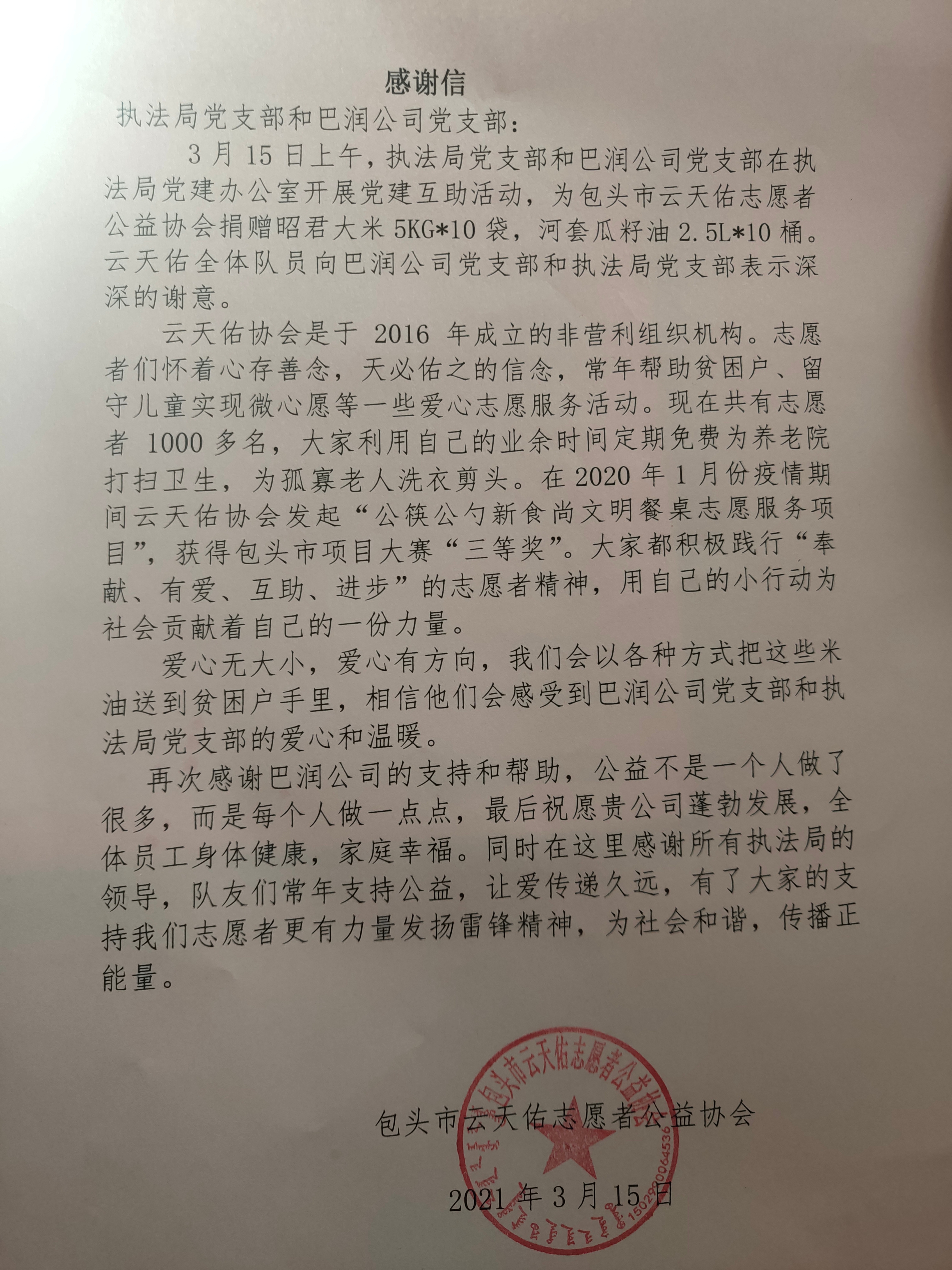 为进一步强化为民服务宗旨意识,充分发挥党建结对共建效益,2021年3月15日上午,中共包头市安全生产综合行政执法局党支部携手包钢集团巴润分公司安环部党支部,共同开展了“结对共建献爱心、支部携手送温暖”活动。两个党支部共同筹措了大米10袋和食用油10桶,赠与包头市云天佑志愿者协会。云天佑志愿者协会代表对两个党支部的捐赠表示感谢,并将尽快把这些米油送到生活困难居民手中,让他们感受到大家的温暖和爱心。两位书记表示,奉献爱心,真情传递,是我们每个人的义务和责任。事后,云天佑志愿者协会还送来了感谢信。