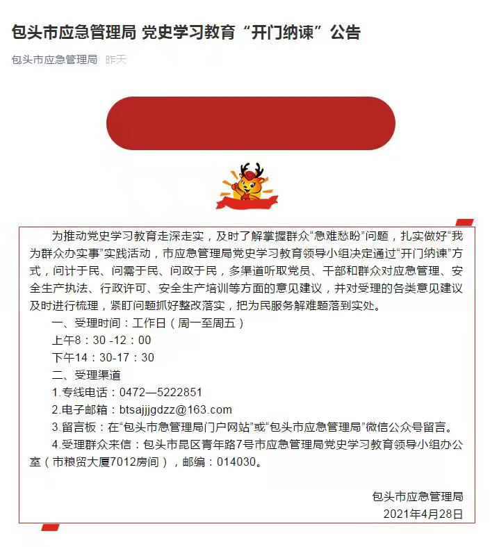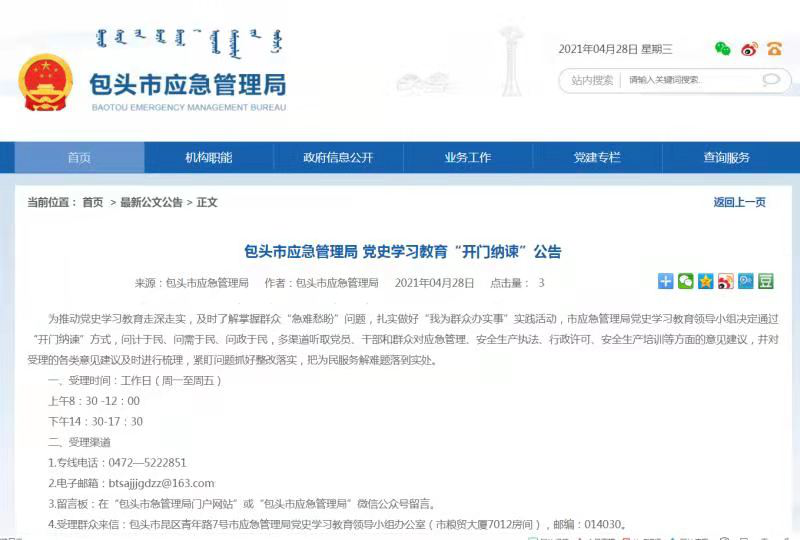 为推动党史学习教育走深走实,及时了解掌握群众“急难愁盼”问题,扎实做好“我为群众办实事”实践活动。4月28日,市应急管理局在门户网站和微信平台同时发布党史学习教育“开门纳谏”公告,问计于民、问需于民、问政于民,多渠道听取党员、干部和群众对应急管理、安全生产执法、行政许可、安全生产培训等方面的意见建议。