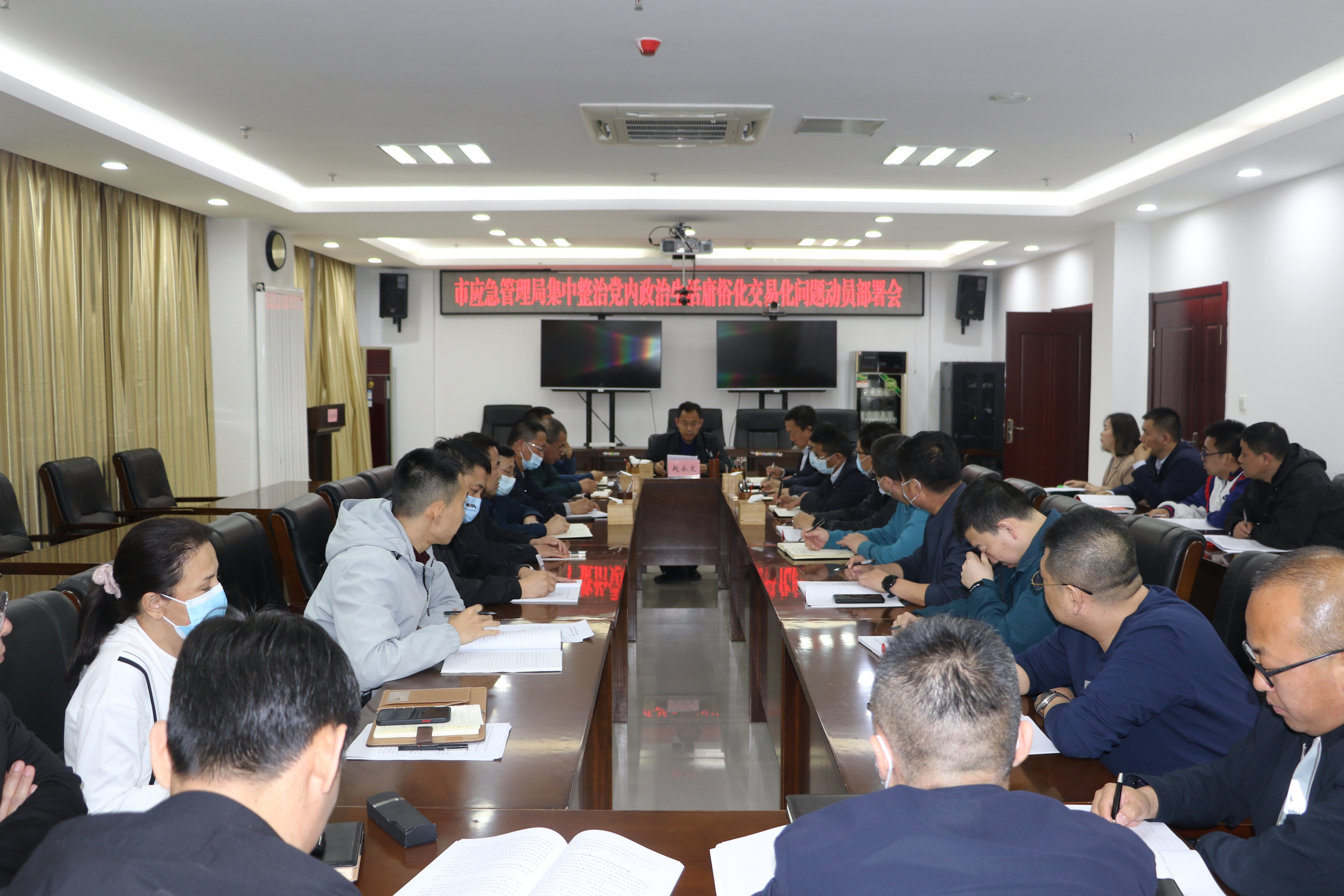 4月22日下午,市应急管理局召开集中整治党内政治生活庸俗化交易化动员部署会,党委书记、局长赵永文主持会议,局领导班子成员,各科室、直属单位副科级以上干部参加了会议。