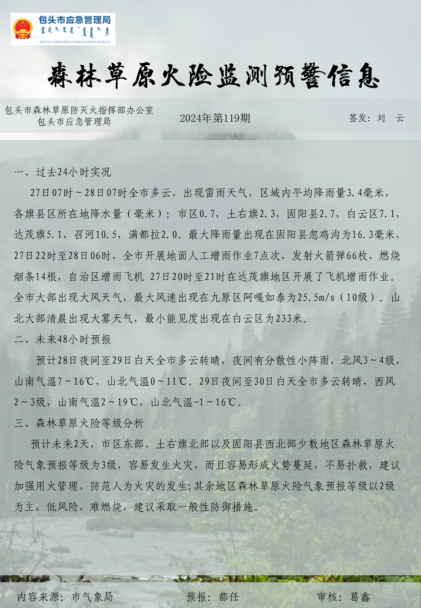 森林草原火险监测预警信息第119期