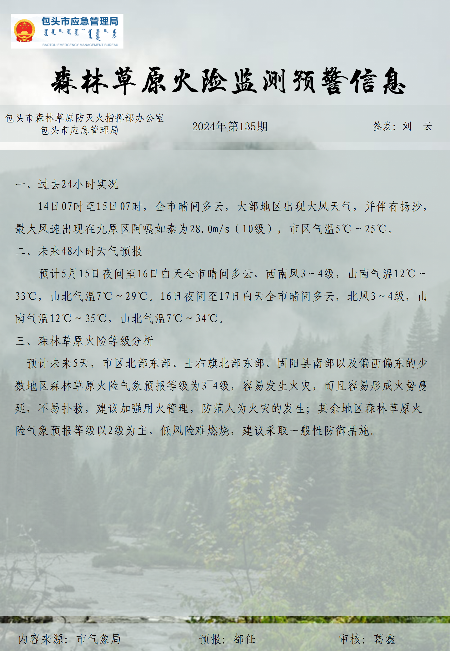 森林草原火险监测预警信息第135期