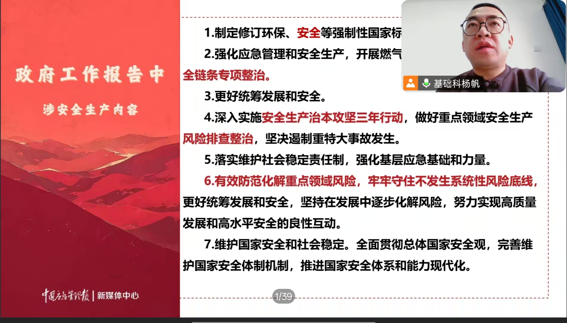 会议通报了2025年“3·11”江苏惠利生物科技有限公司燃爆事故、2022年包头市昆都仑区“3•14”较大火灾事故等近年来全国典型事故案例;传达学习了党的二十届三中全会和《2025年国务院政府工作报告》对于安全生产的要求;对近期安全生产工作进行了部署。