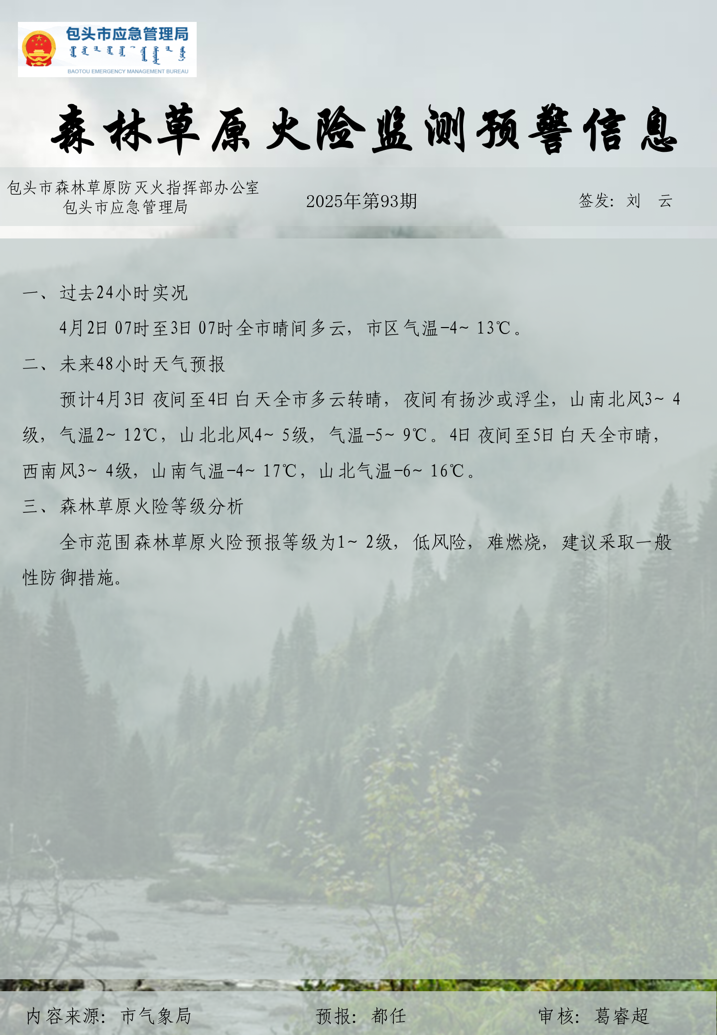 森林草原火险监测预警信息第93期