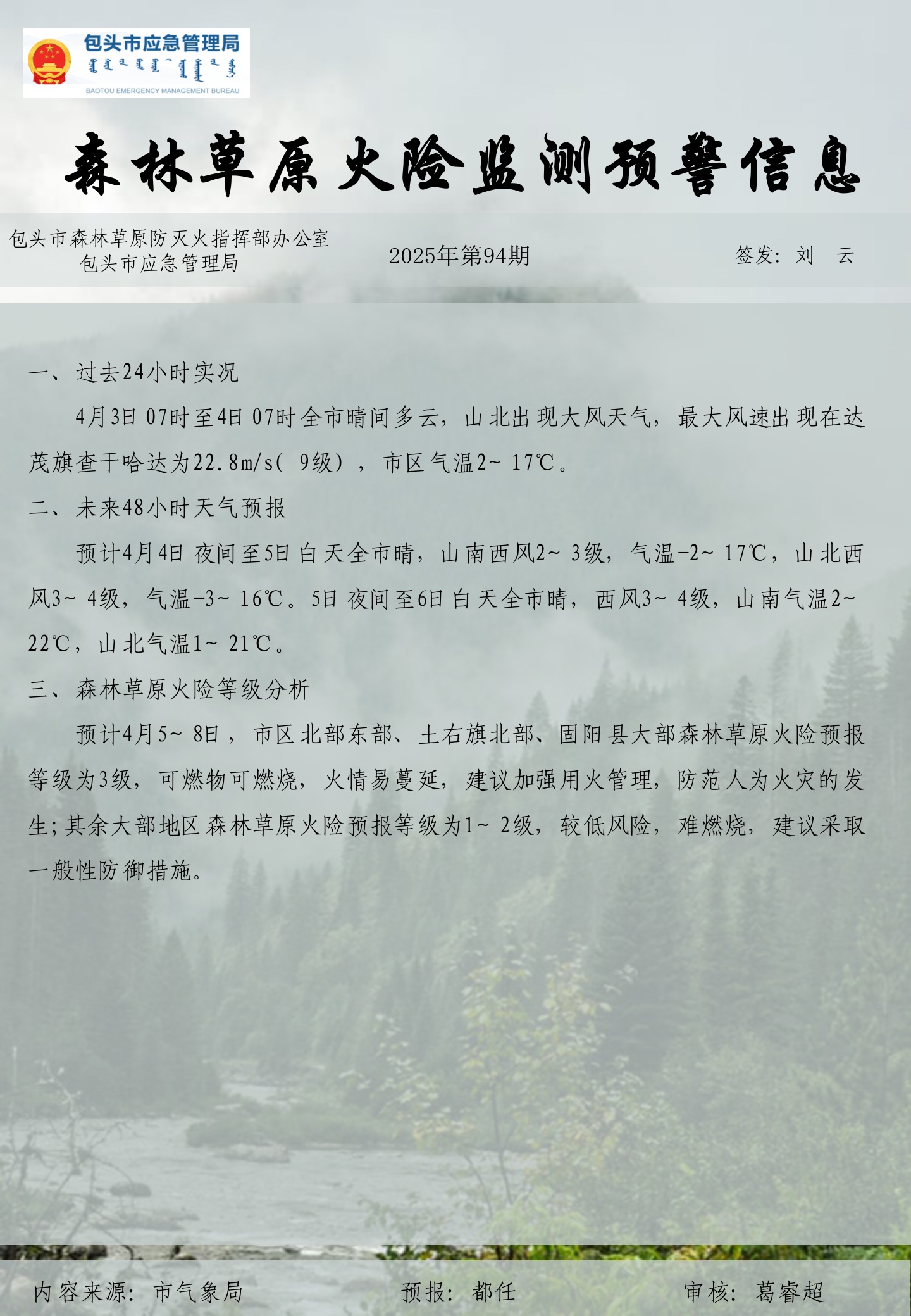 森林草原火险监测预警信息第94期