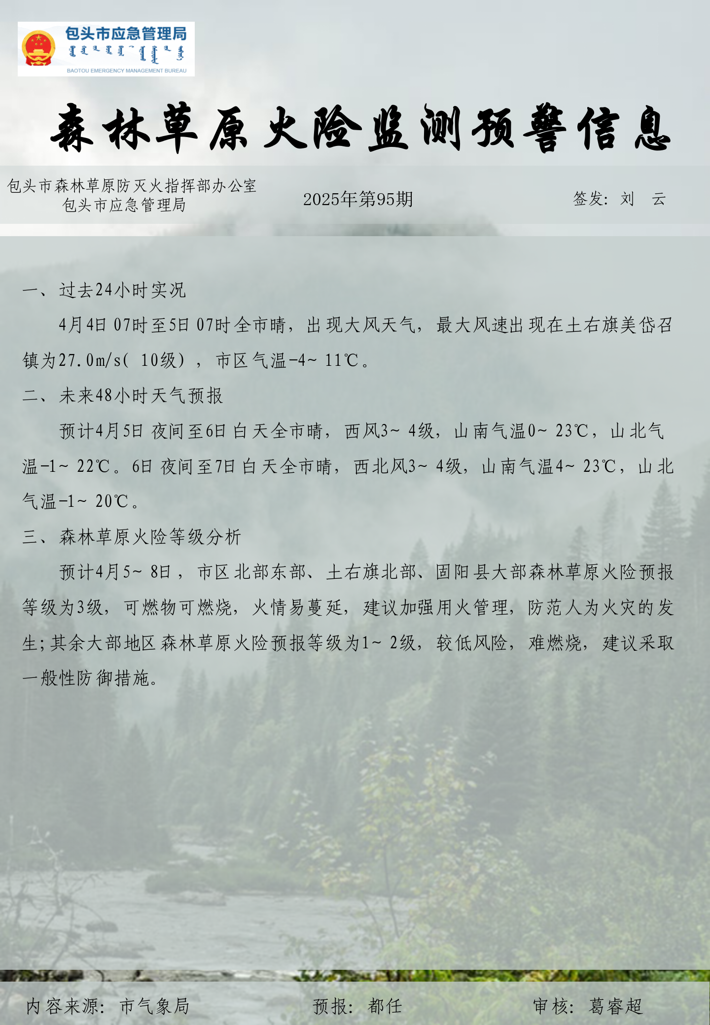 森林草原火险监测预警信息第95期