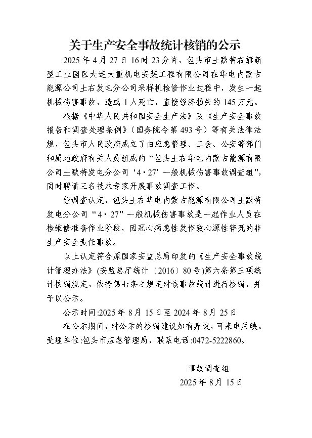 包头土右华电内蒙古能源有限公司土默特发电分公司‘4·27’一般机械伤害事故核销公示