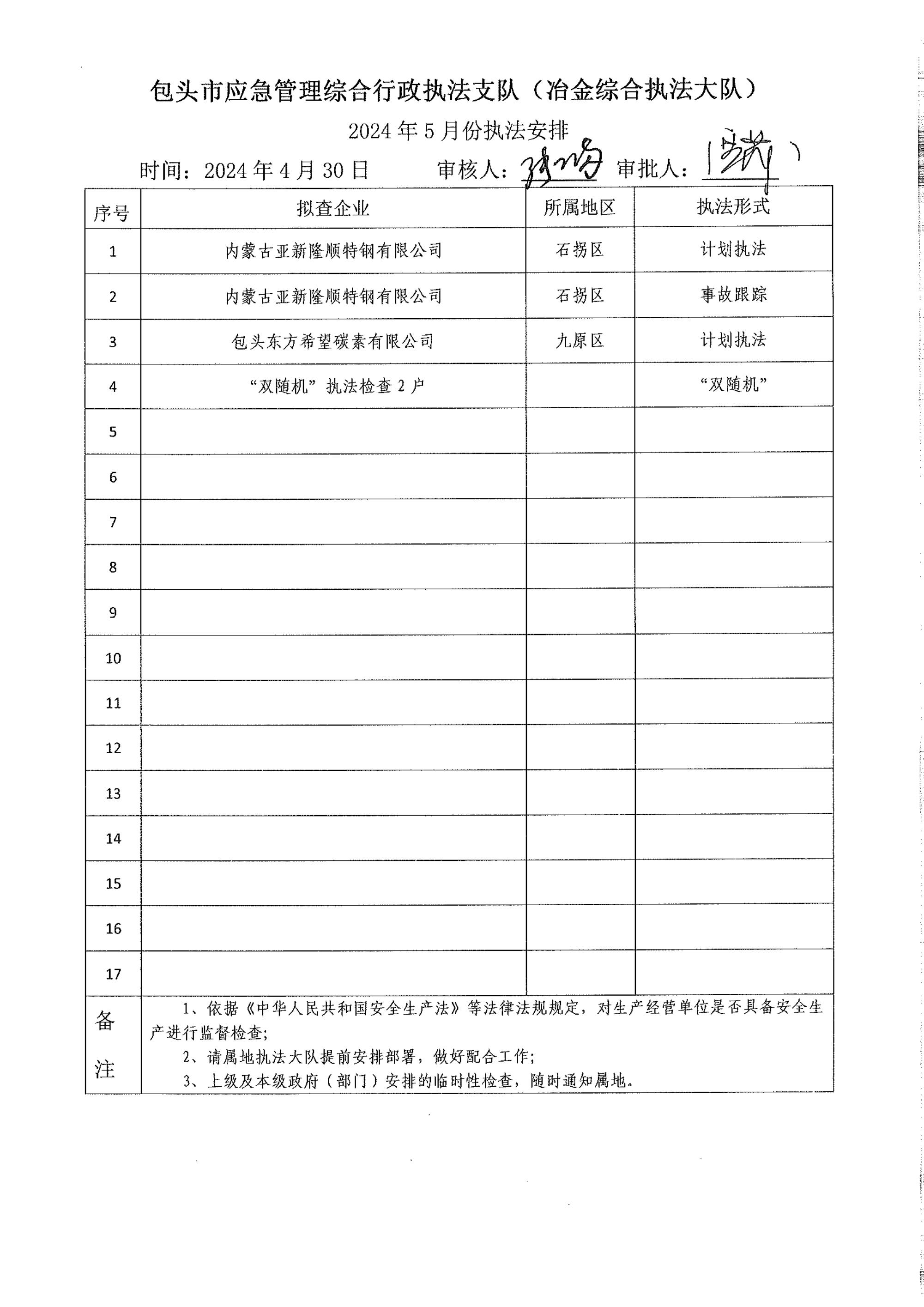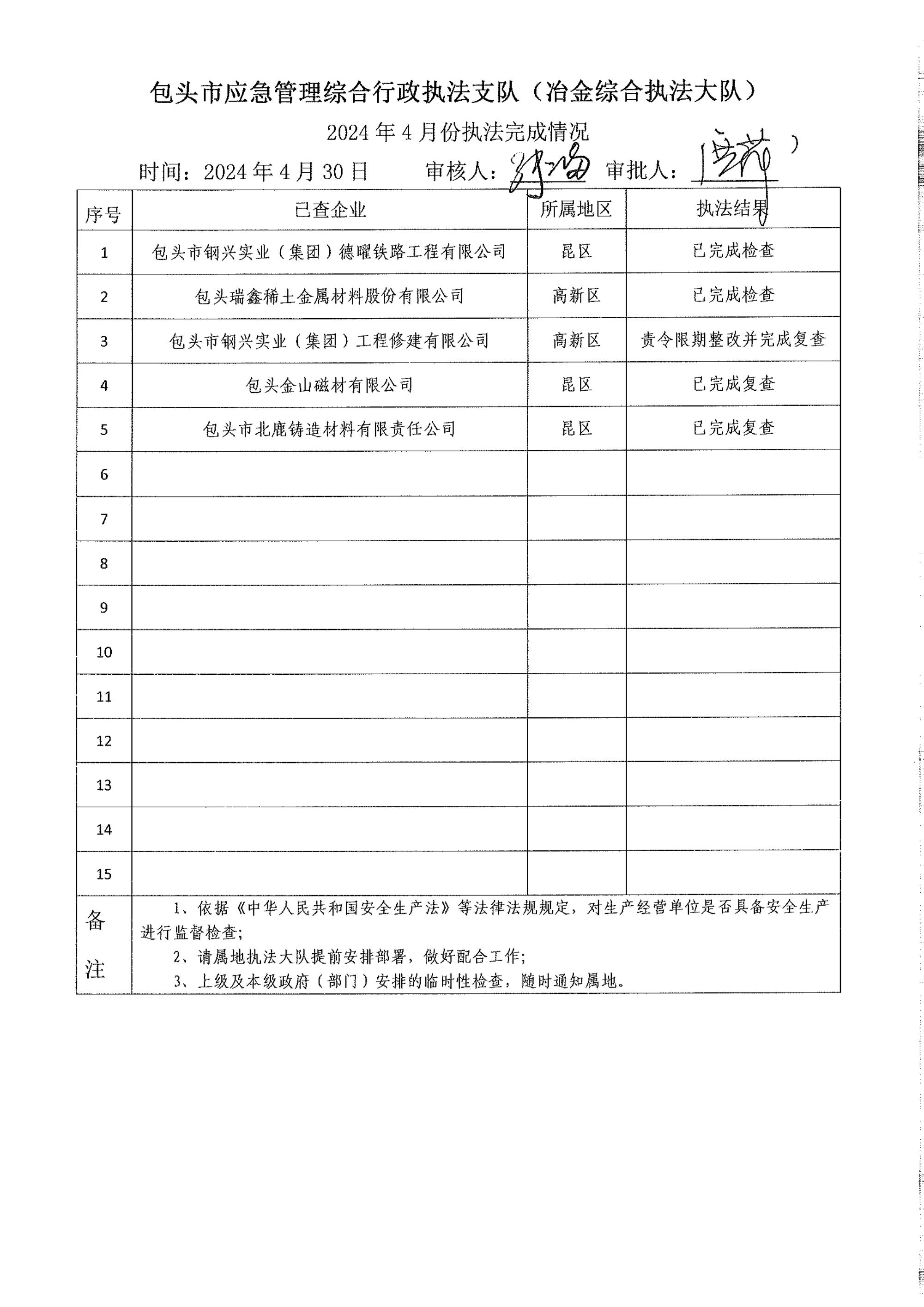 市应急执法支队冶金综合执法大队2024年4月份执法检查完成情况及2024年5月份执法检查安排公示