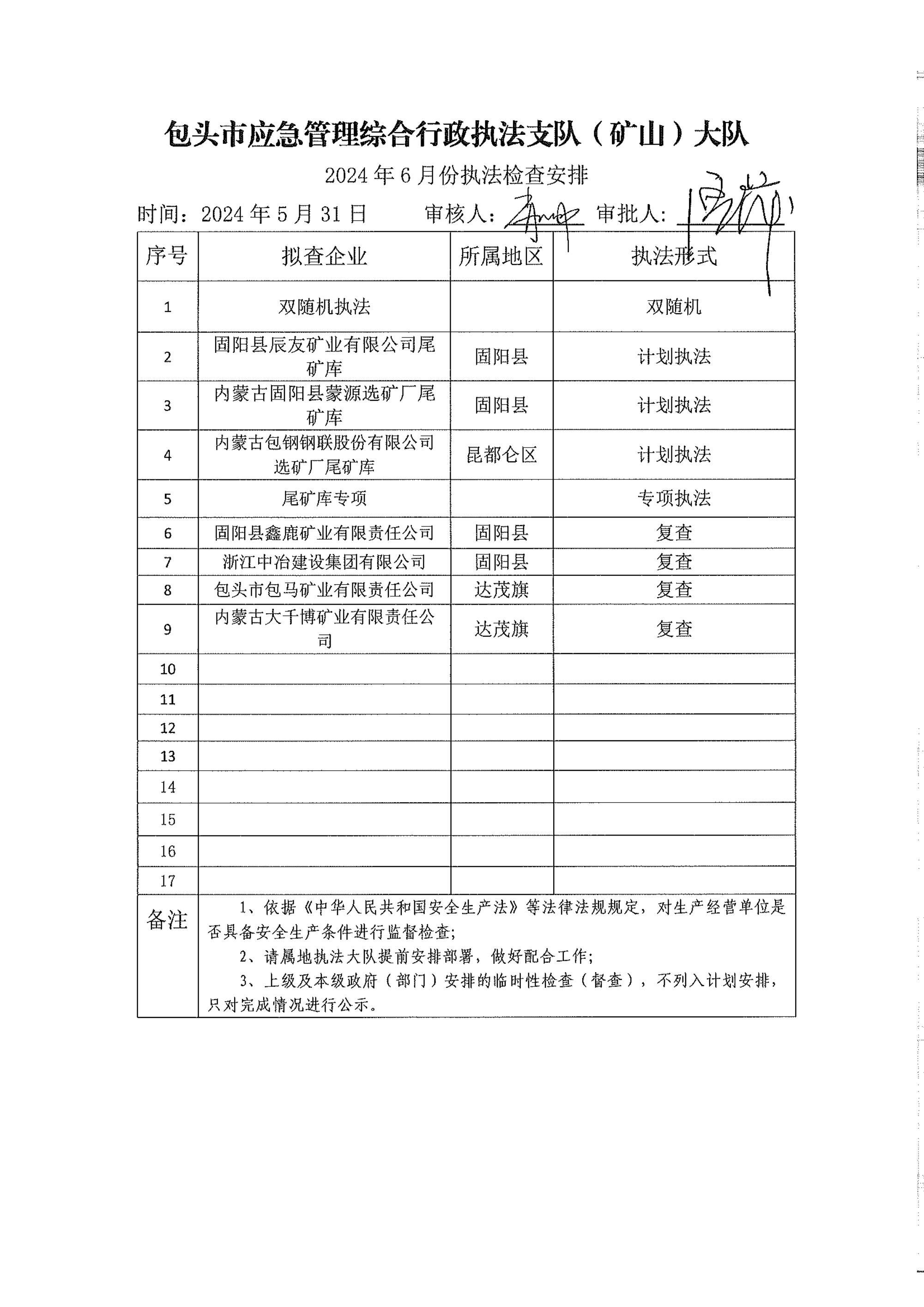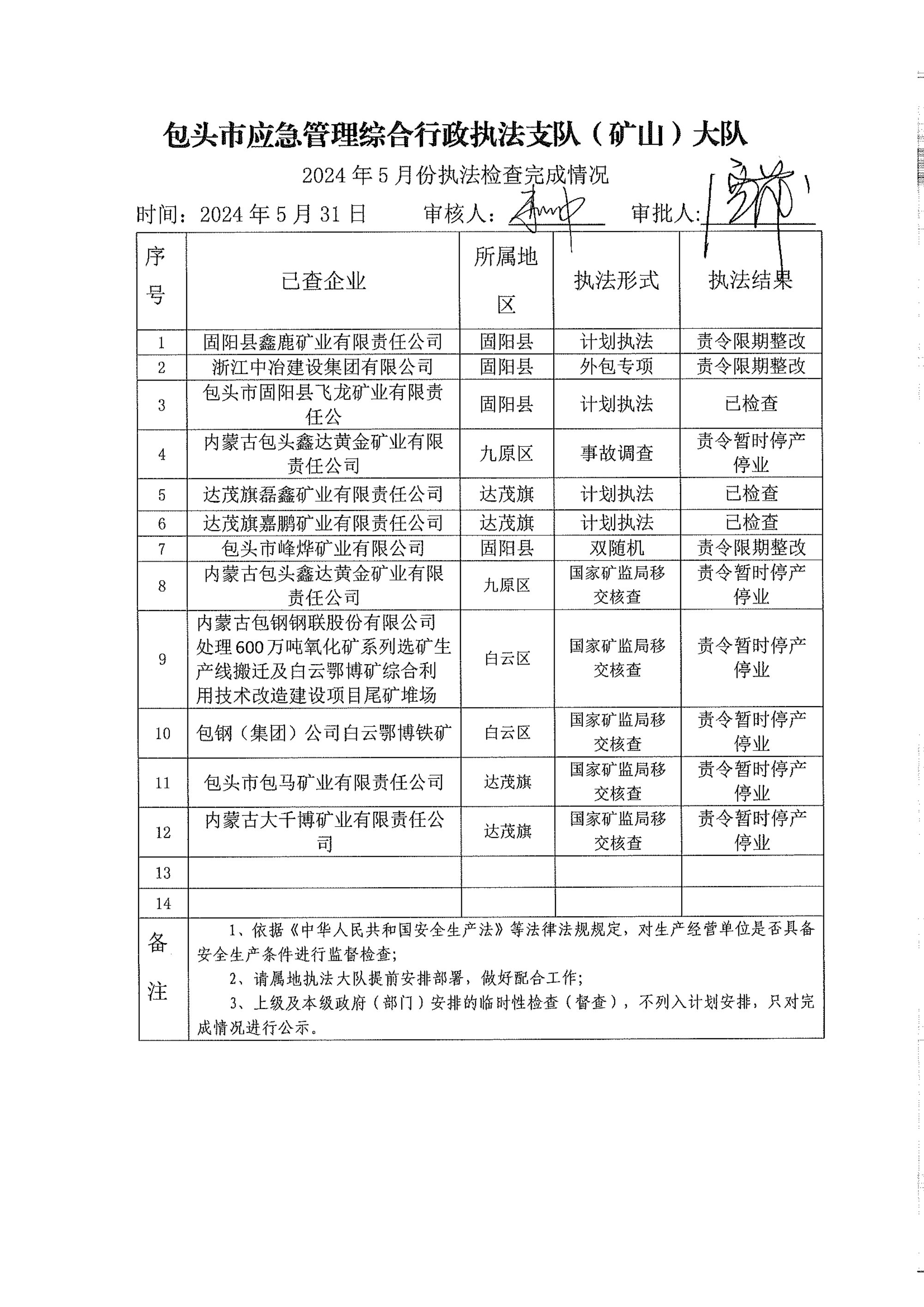 市应急执法支队矿山安全执法大队2024年5月份执法检查完成情况及2024年6月份执法检查安排公示