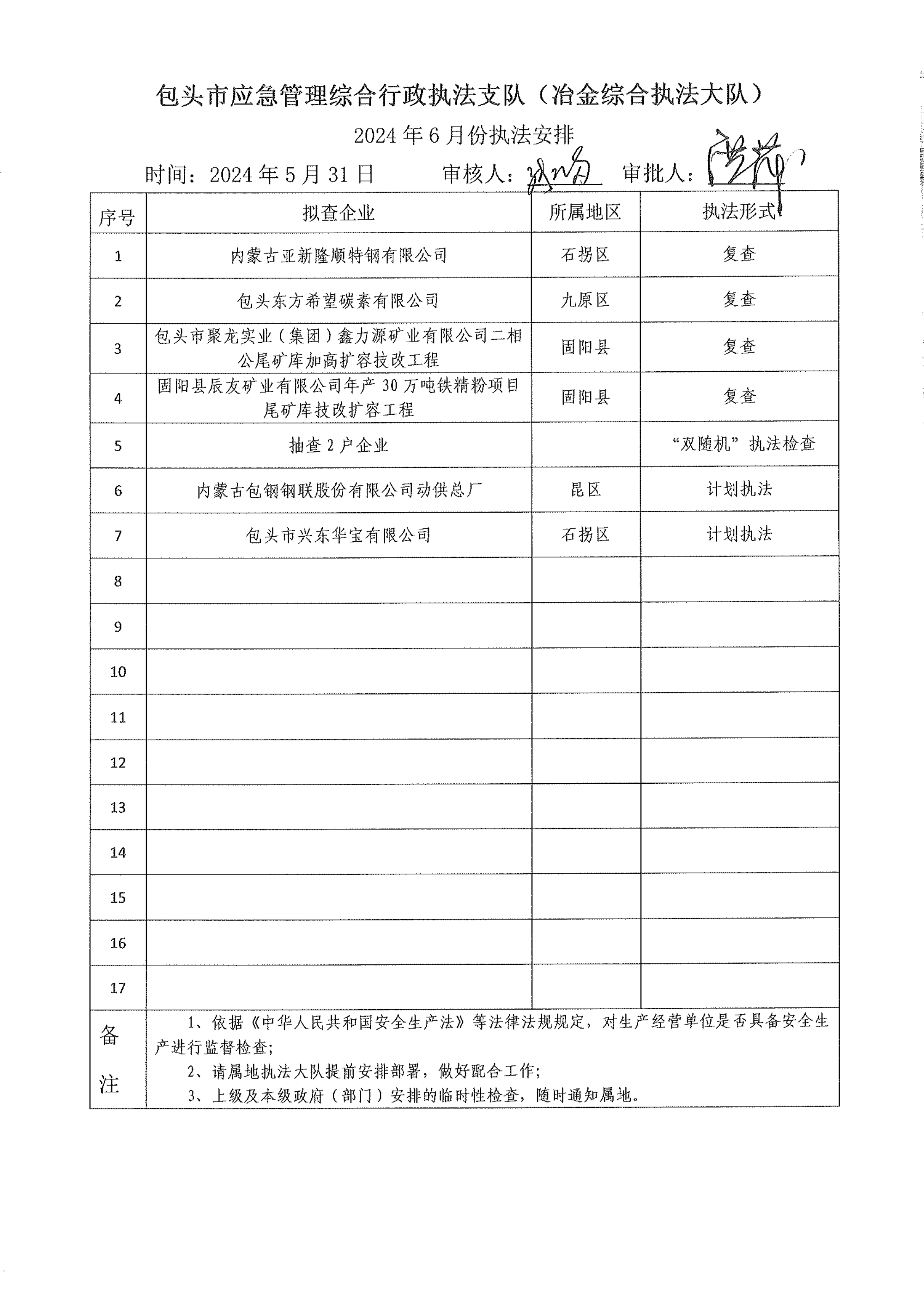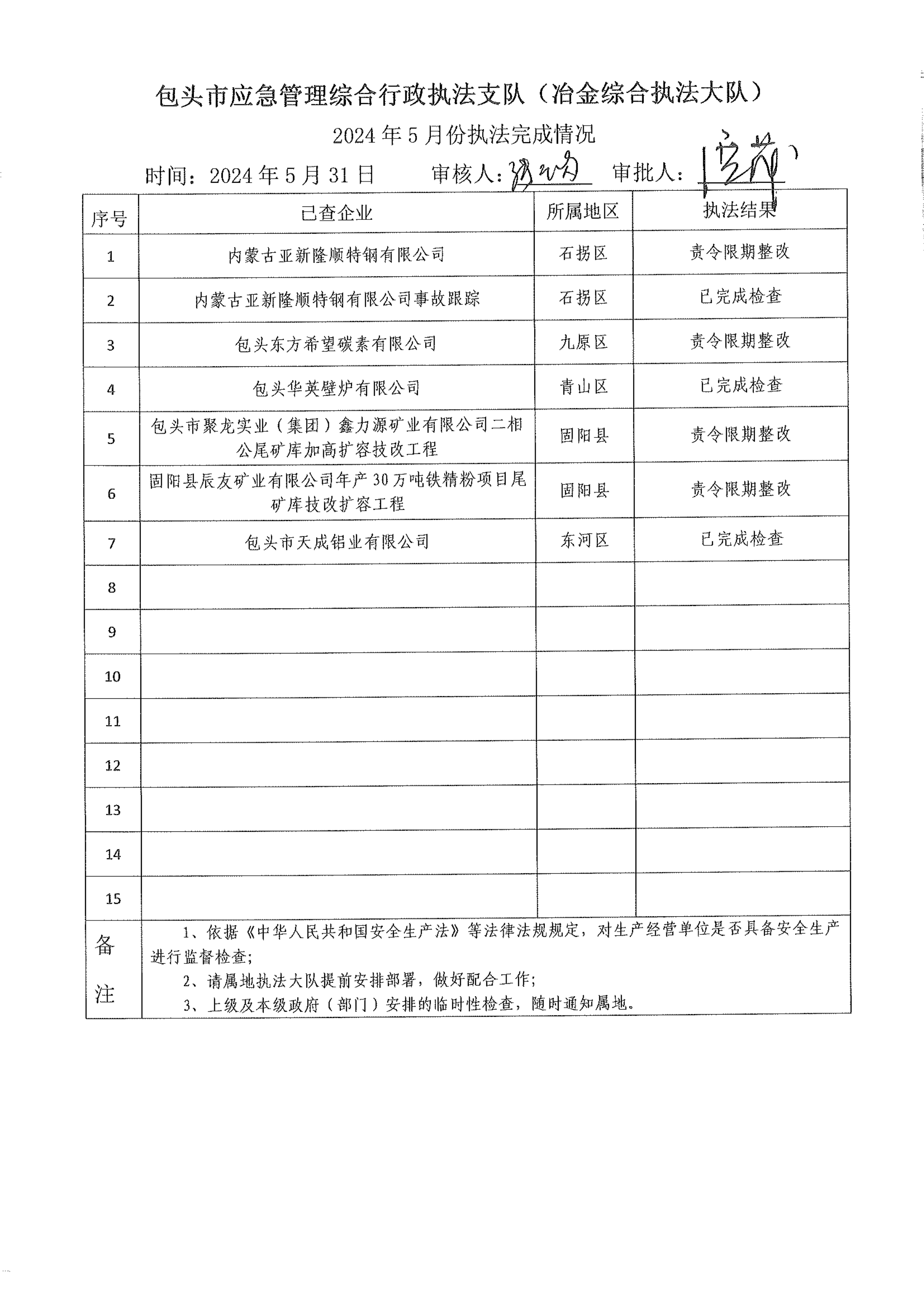市应急执法支队冶金综合执法大队2024年5月份执法检查完成情况及2024年6月份执法检查安排公示