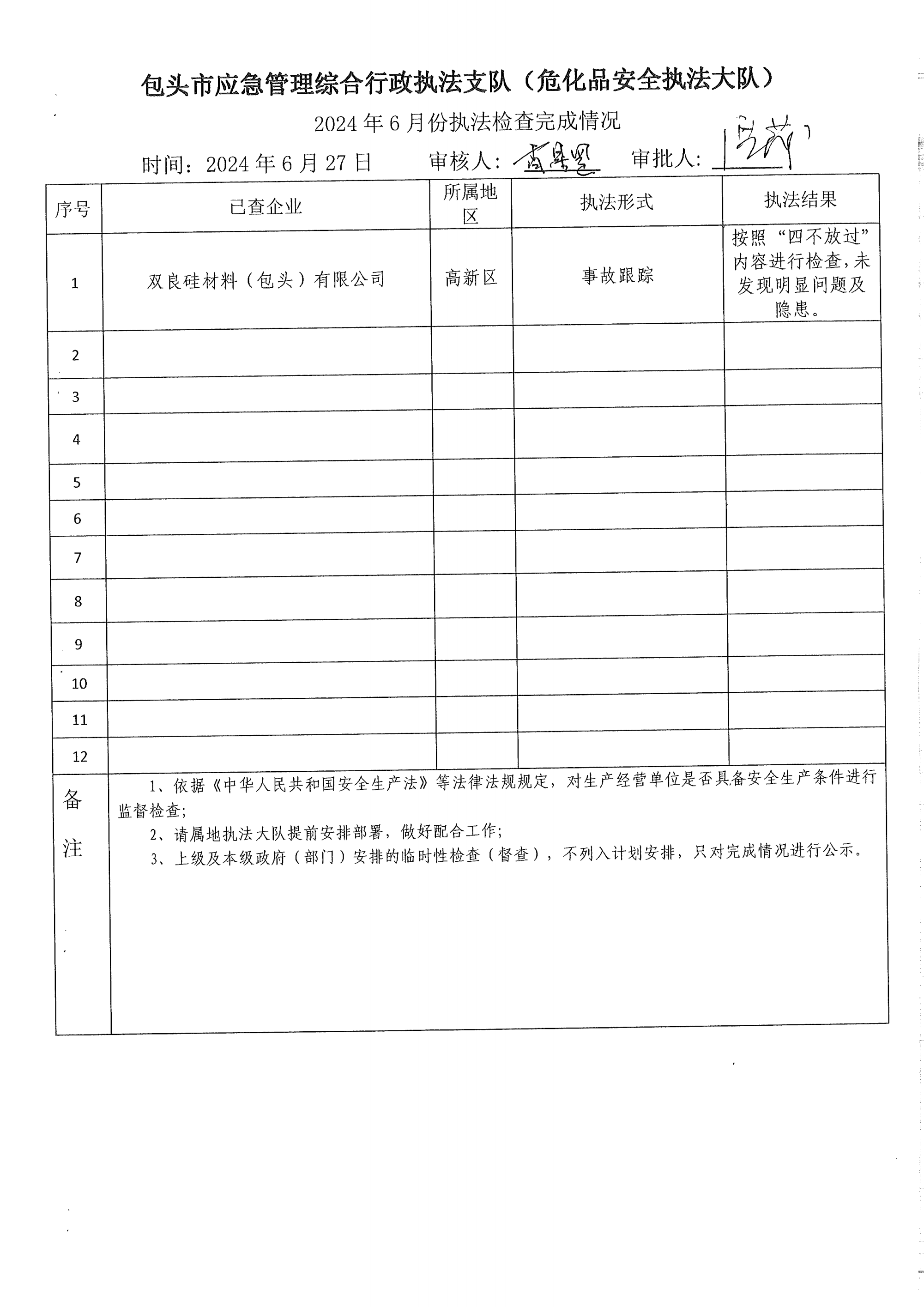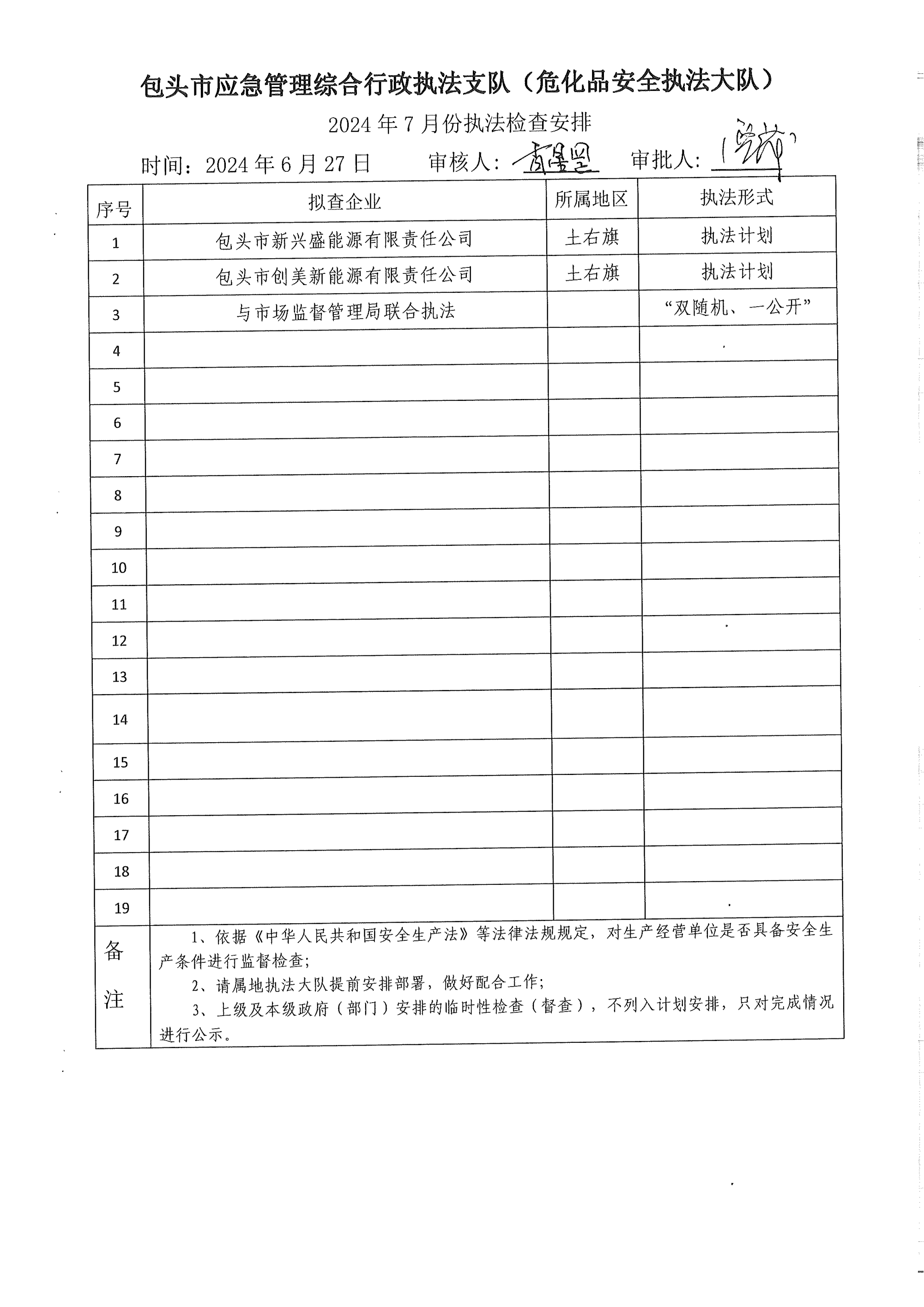 市应急执法支队危化品安全执法大队2024年6月份执法检查完成情况及2024年7月份执法检查安排公示