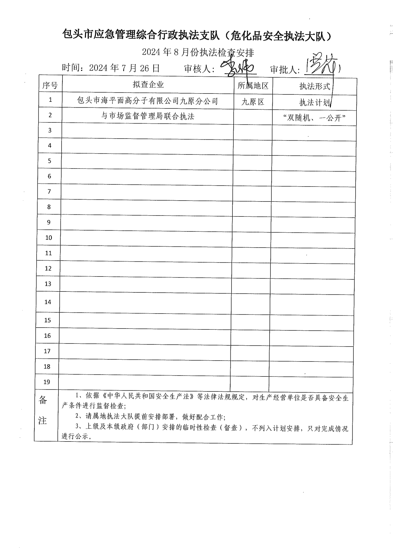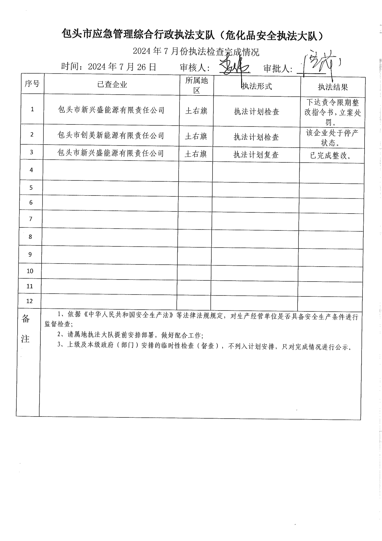 市应急执法支队危化品安全执法大队2024年7月份执法检查完成情况及2024年8月份执法检查安排公示