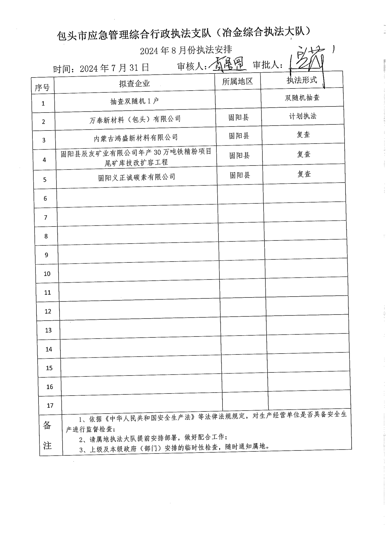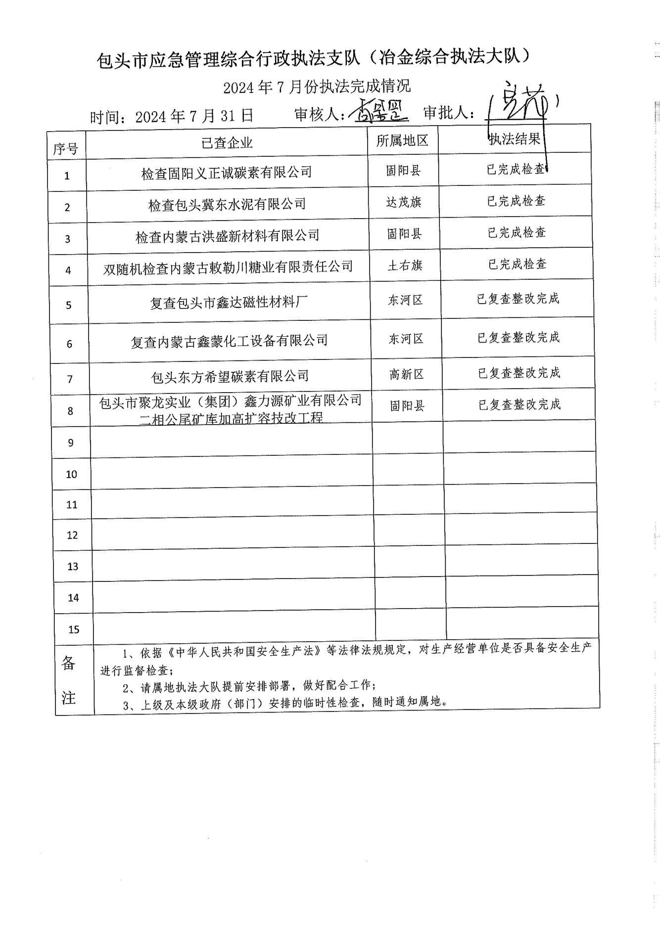 市应急执法支队冶金综合执法大队2024年7月份执法检查完成情况及2024年8月份执法检查安排公示