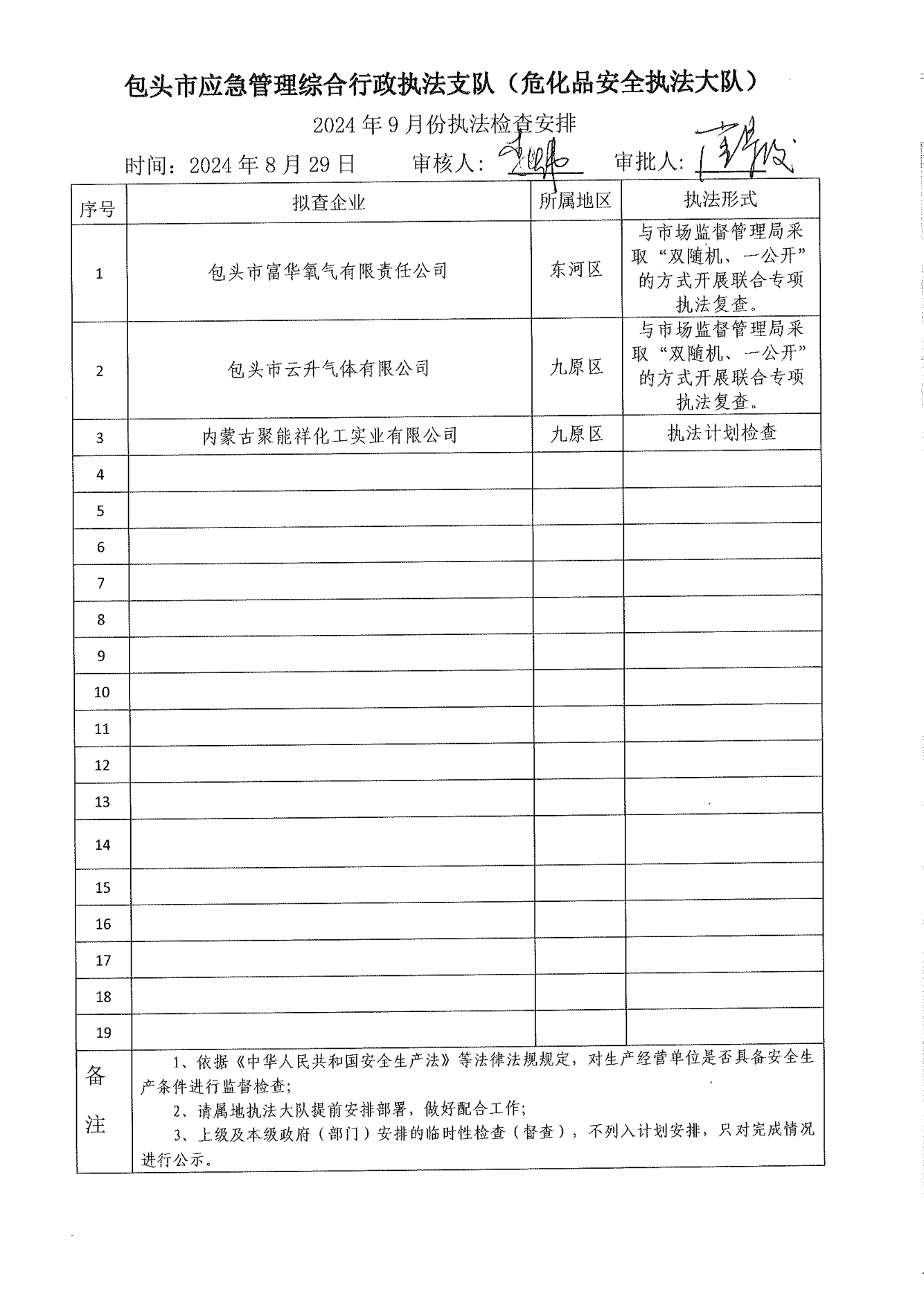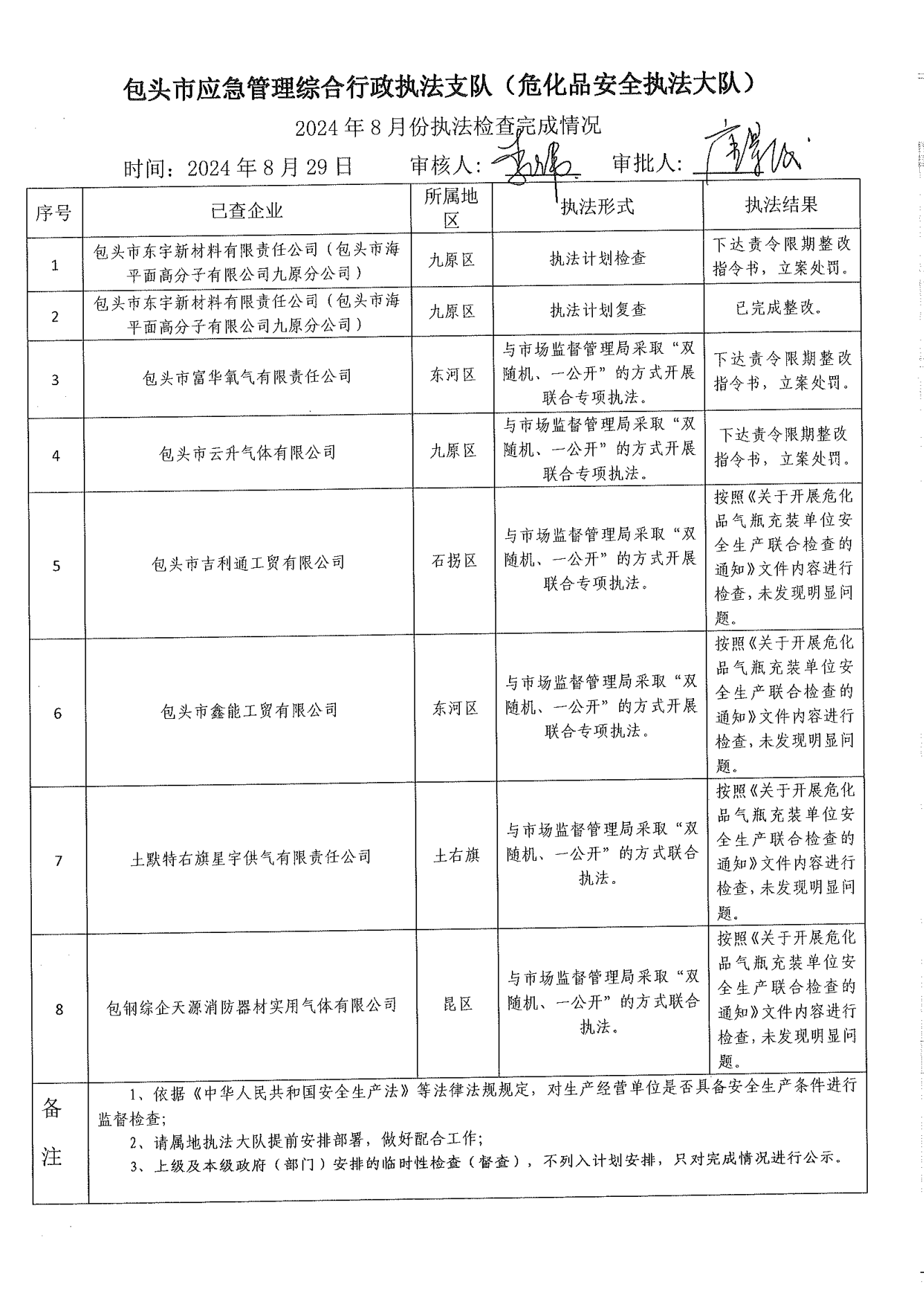 市应急执法支队危化品安全执法大队2024年8月份执法检查完成情况及2024年9月份执法检查安排公示