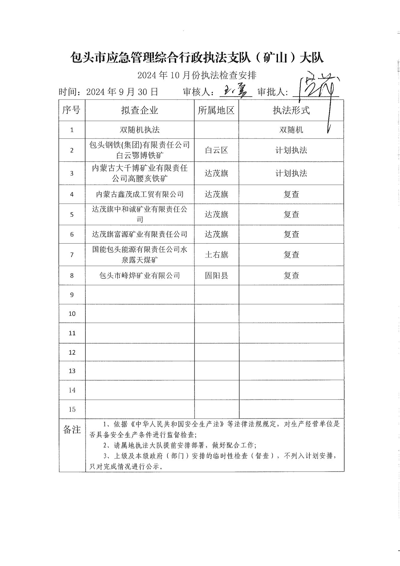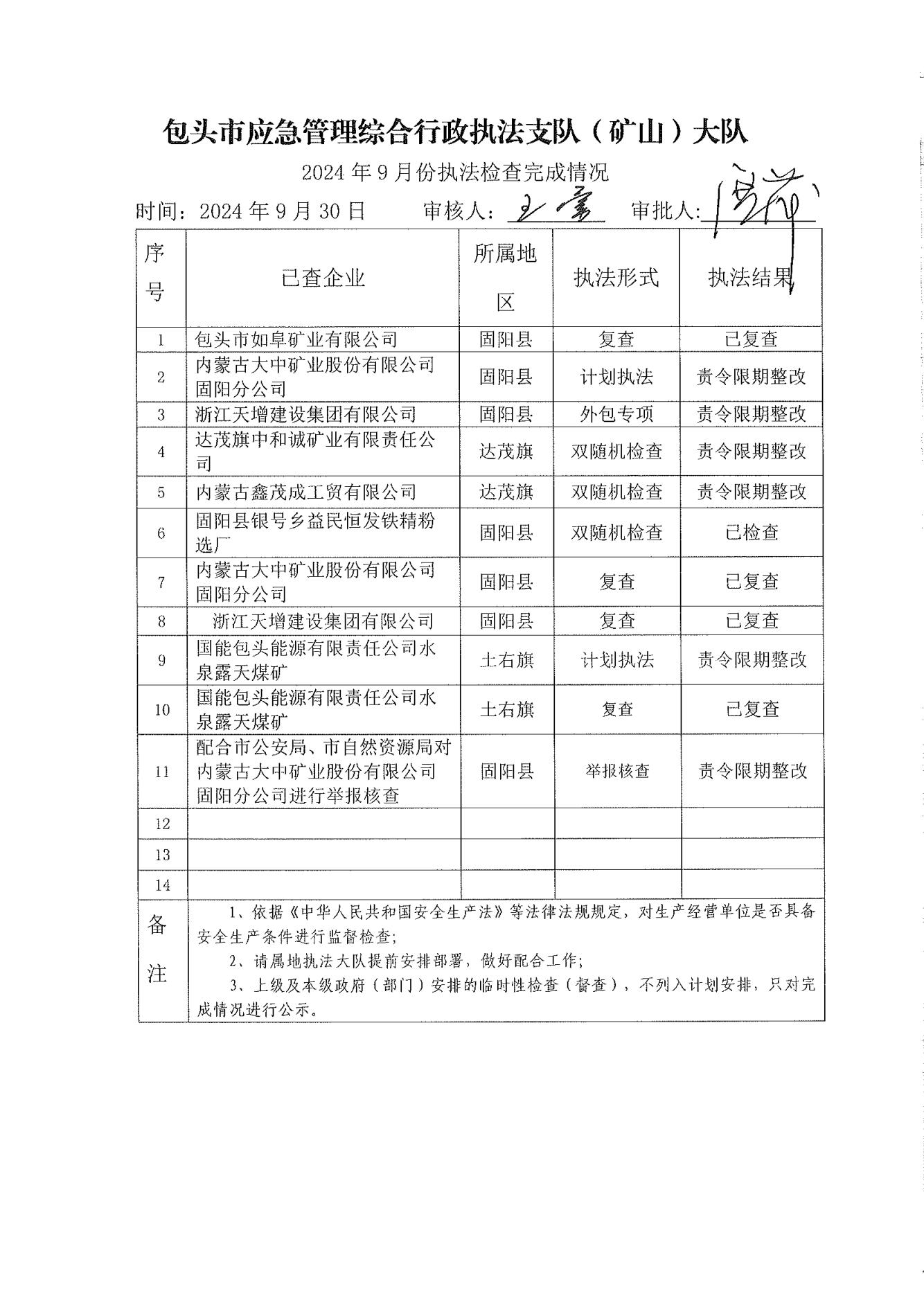 市应急执法支队矿山安全执法大队2024年9月份执法检查完成情况及2024年10月份执法检查安排公示