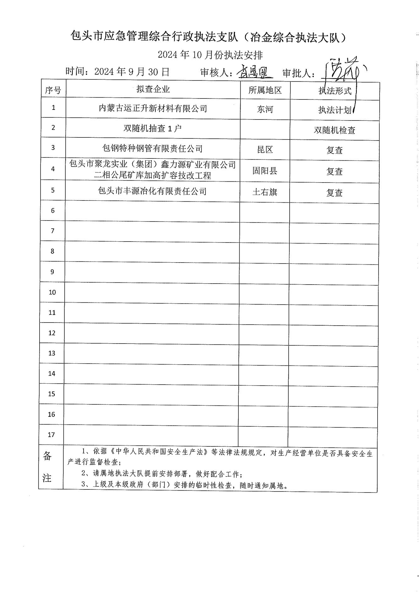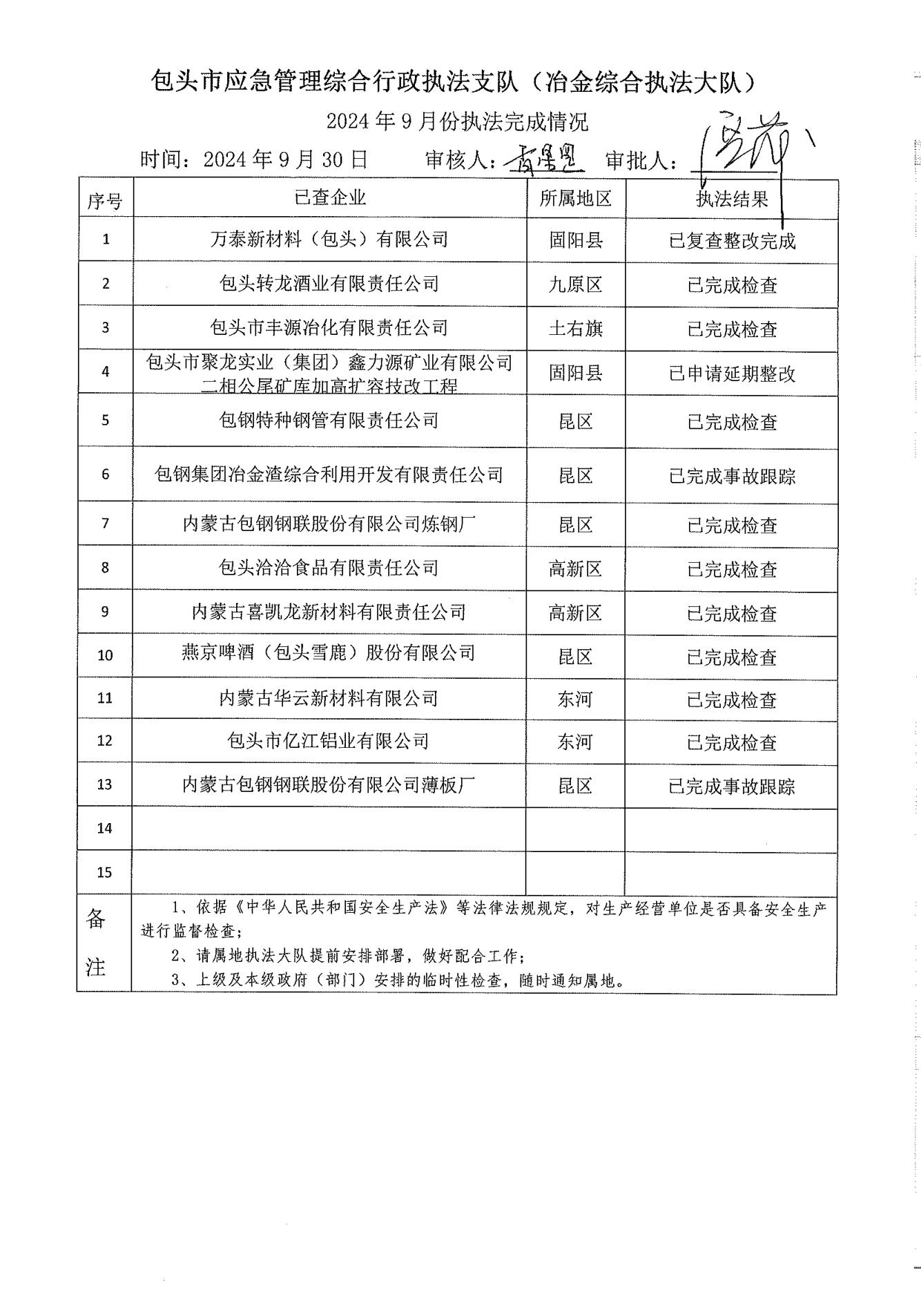 市应急执法支队冶金综合执法大队2024年9月份执法检查完成情况及2024年10月份执法检查安排公示