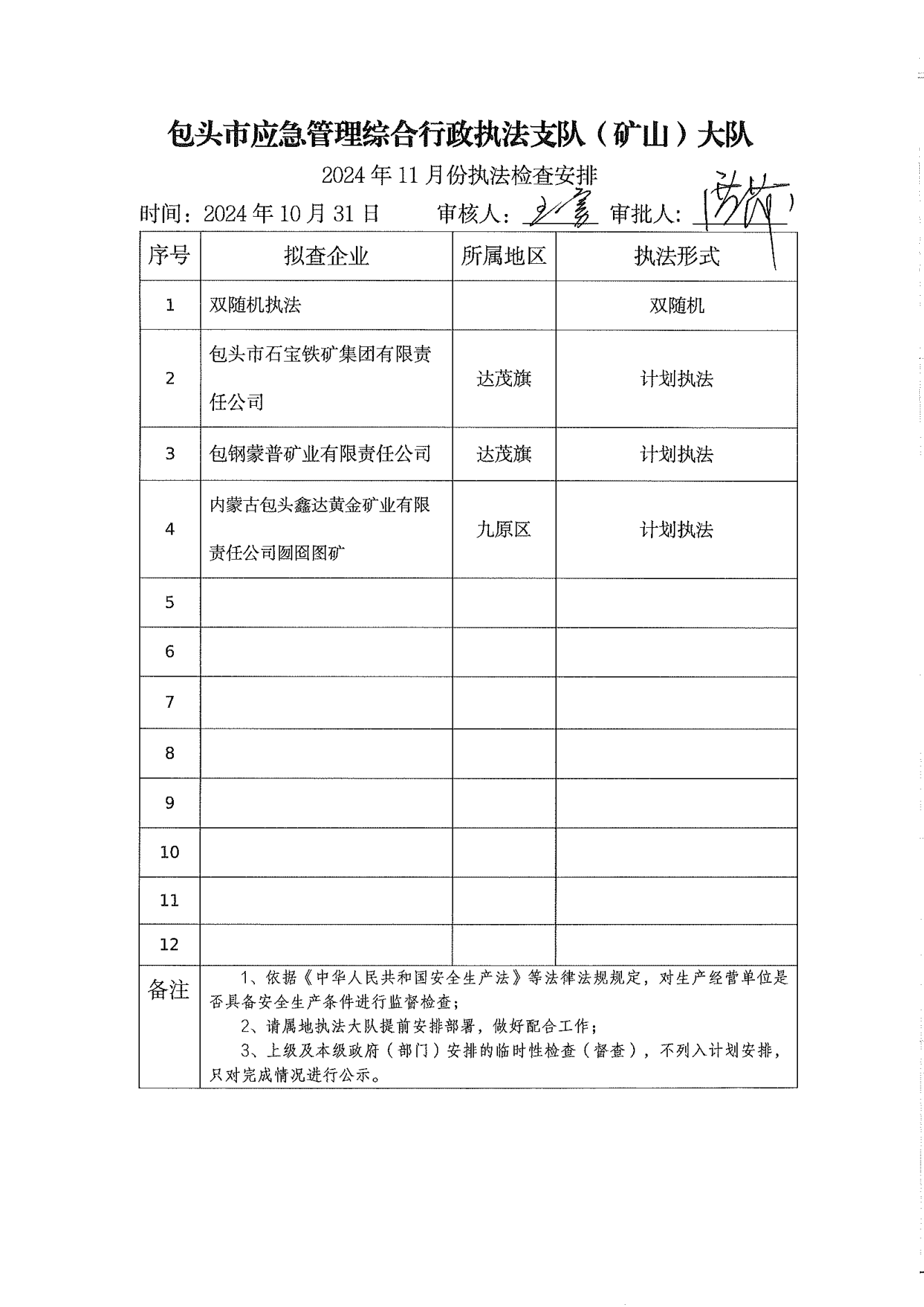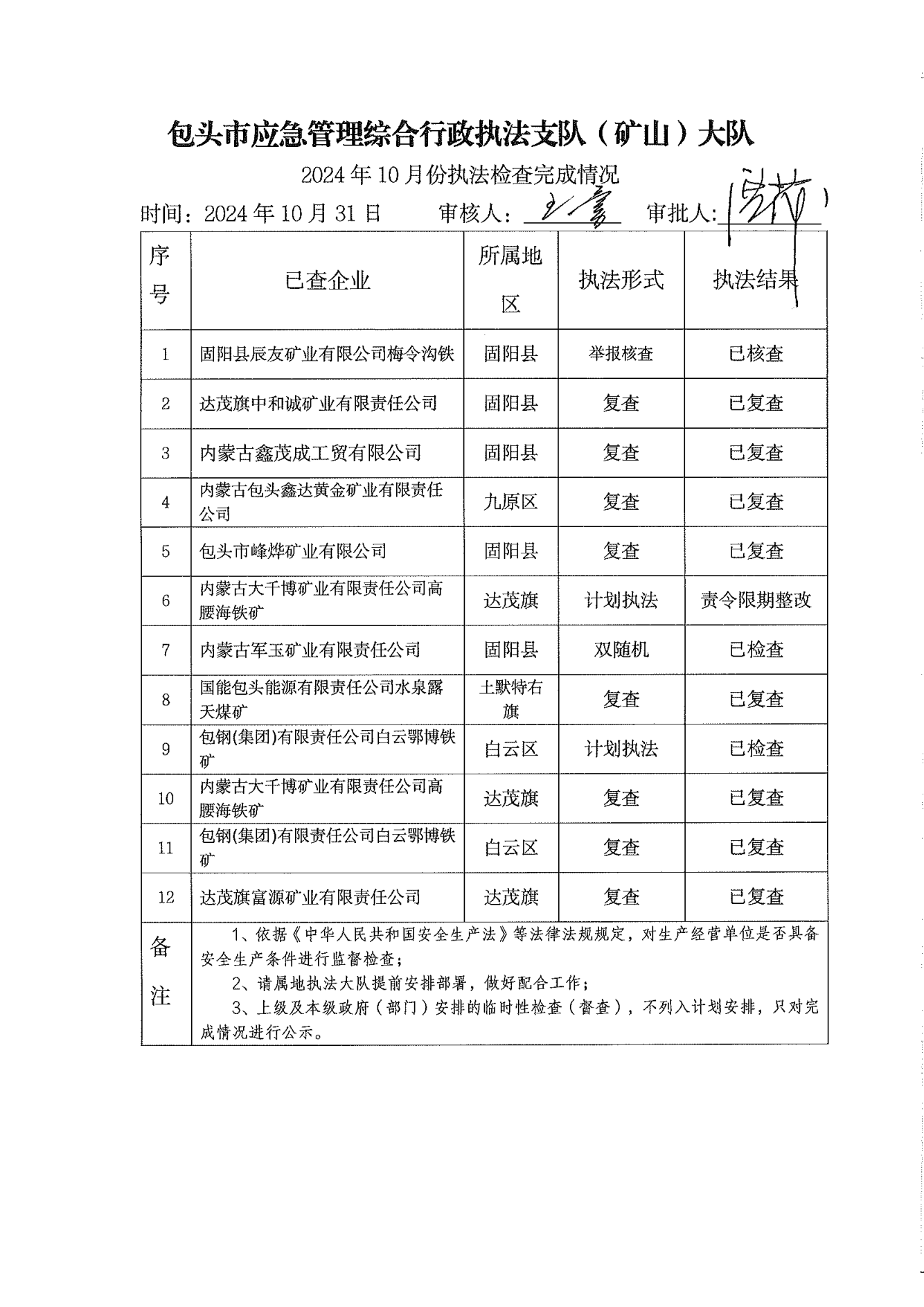 市应急执法支队矿山安全执法大队2024年10月份执法检查完成情况及2024年11月份执法检查安排公示
