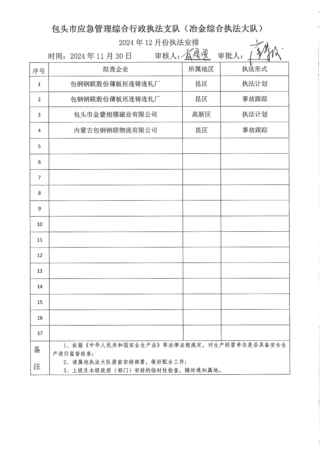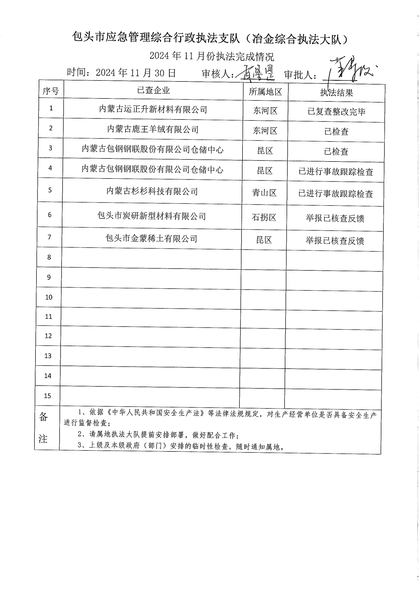 市应急执法支队工贸安全执法大队2024年11月份执法检查完成情况及2024年12月份执法检查安排公示