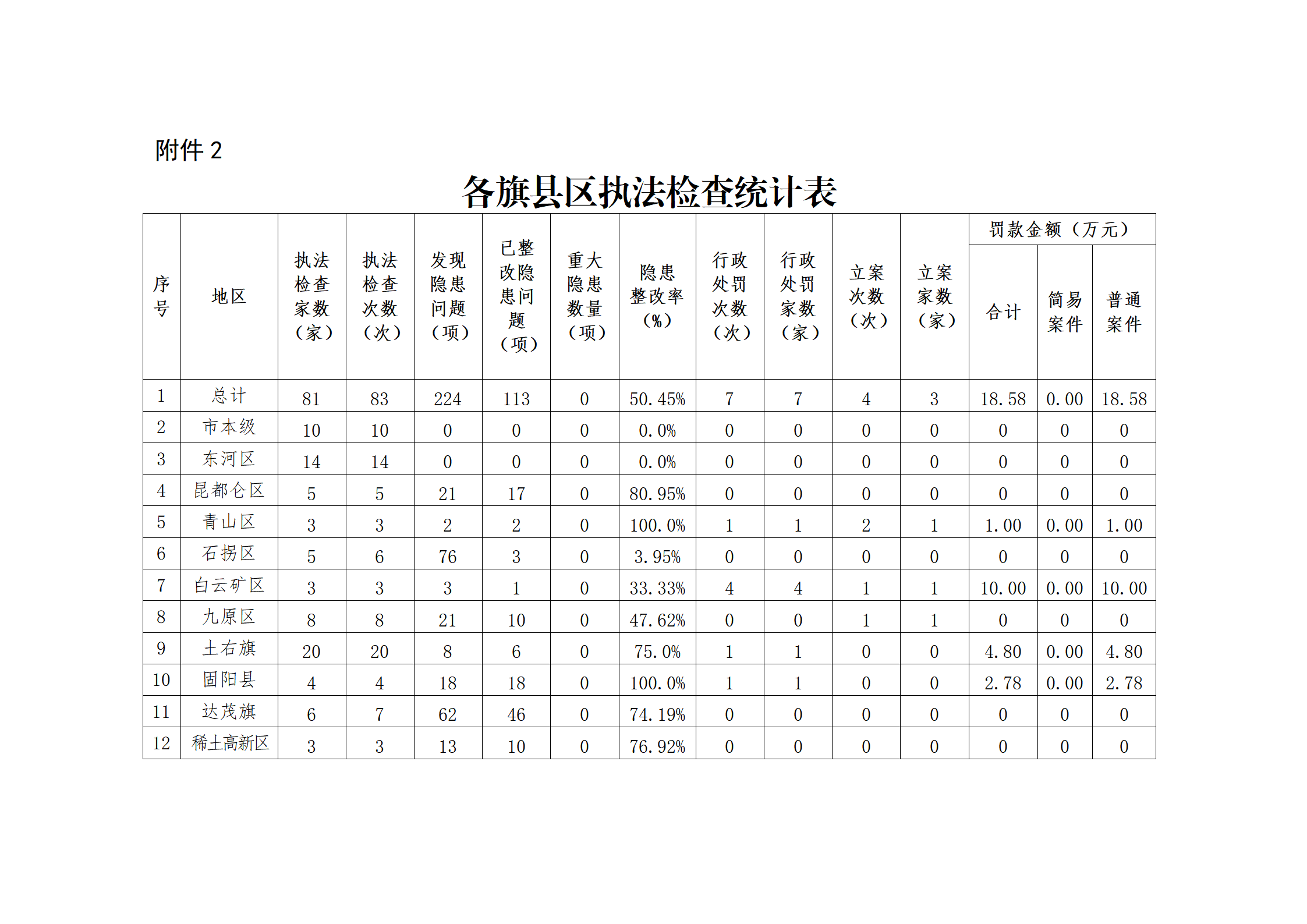 2.各旗县区执法检查统计表