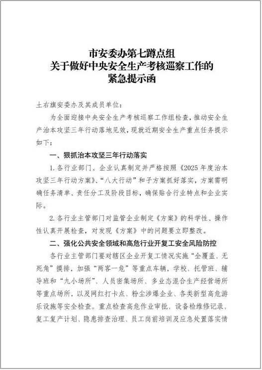 三是“清单式”整改促成效。通过问题风险“三单三函”督办等一系列措施,压实土右旗各行业部门“三管三必须”主体责任,达到监管能力提升的工作目标。指导土右旗安委办在中央安全生产考核巡察期间向土右旗各行业部门发送了《市安委办第七蹲点组关于做好中央安全生产考核巡察工作的紧急提示函》及日常监管领域发现的重大风险隐患提示函共计25份,实现了风险隐患及时治理、有效治理、闭环治理,推动土右旗各行业部门监管责任落地见效。