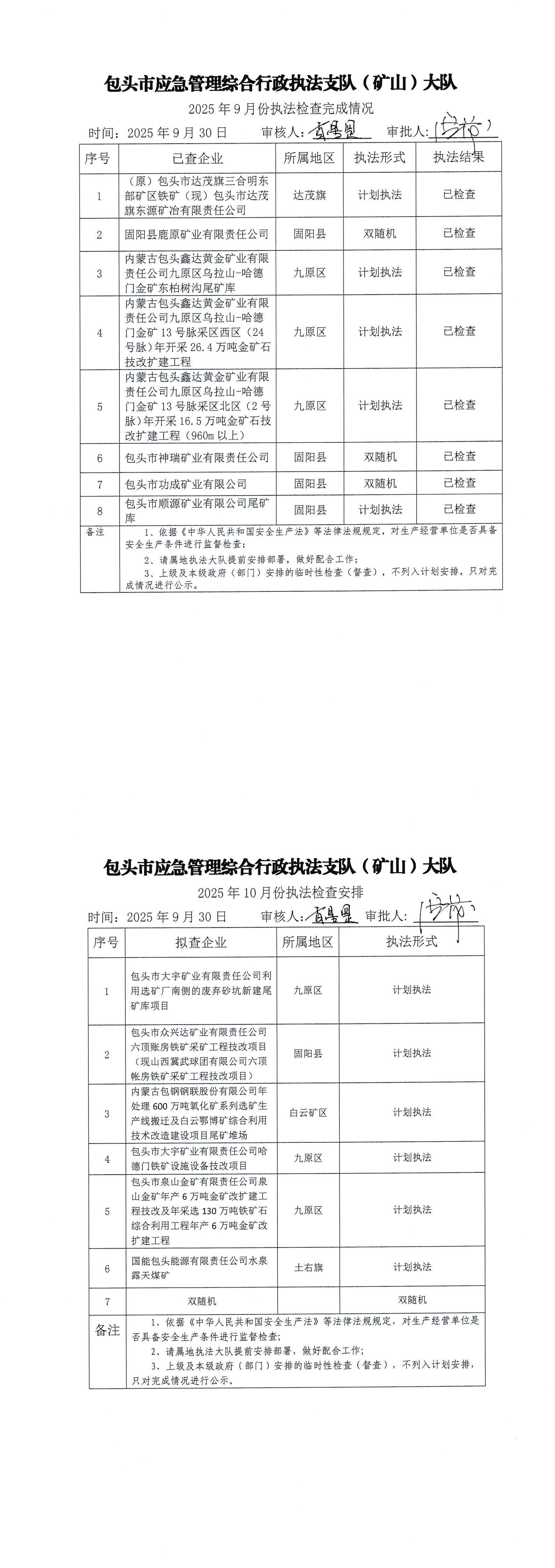 矿山大队2025年9月执法检查完成情况及2025年10月执法检查安排公示