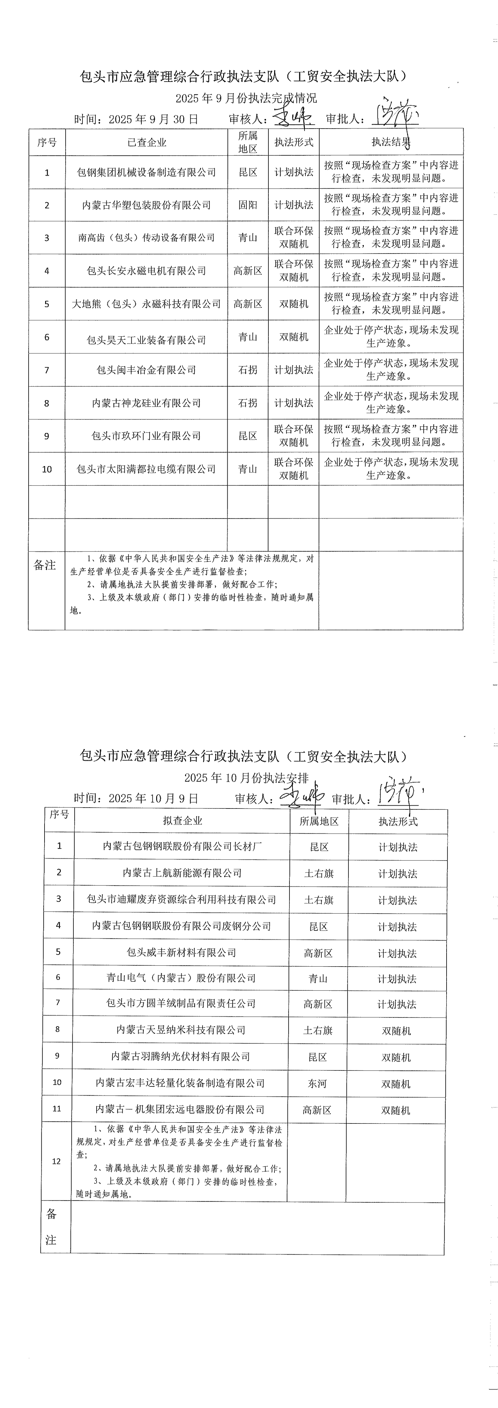 工贸大队2025年9月执法检查完成情况及2025年10月执法检查安排公示