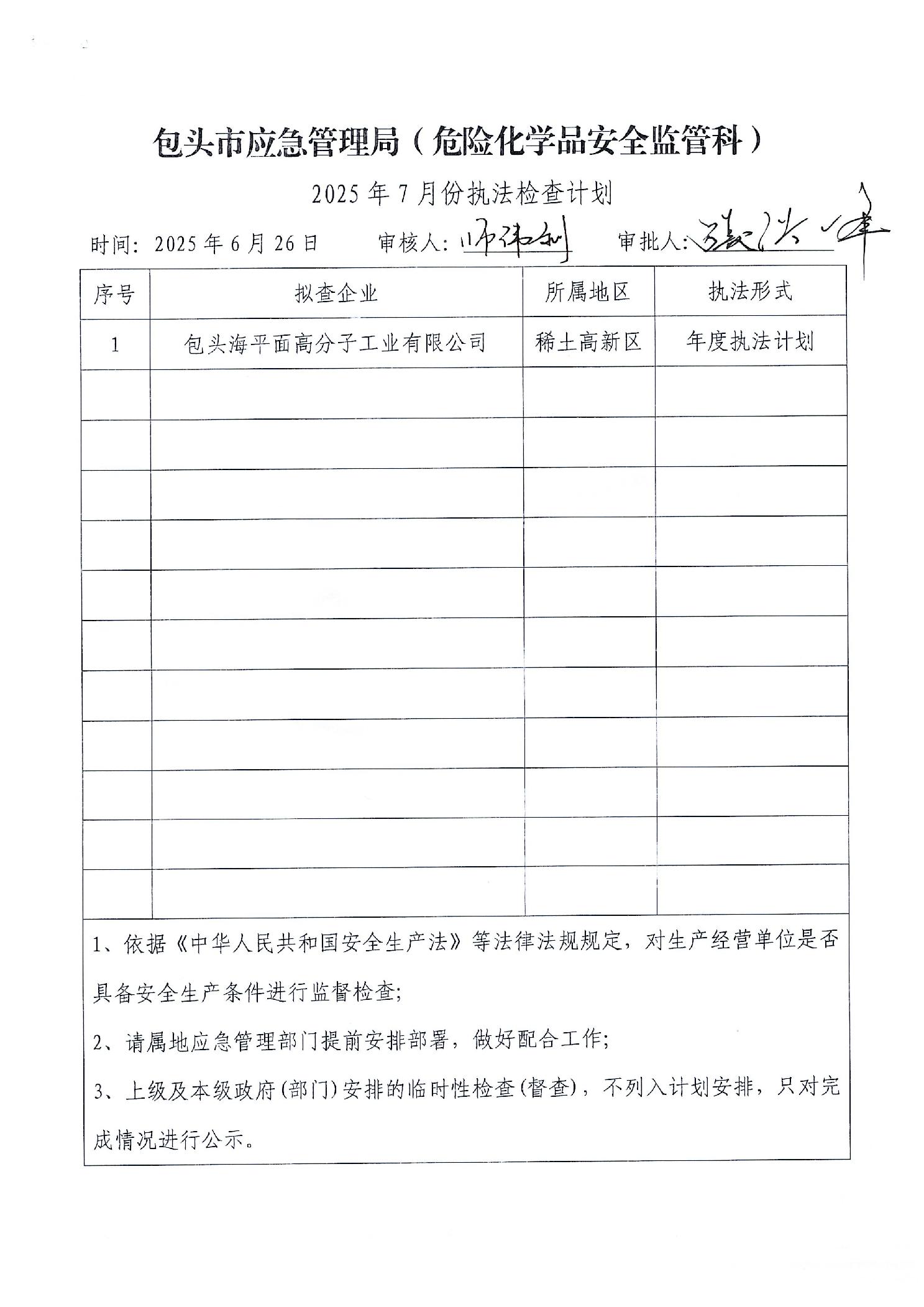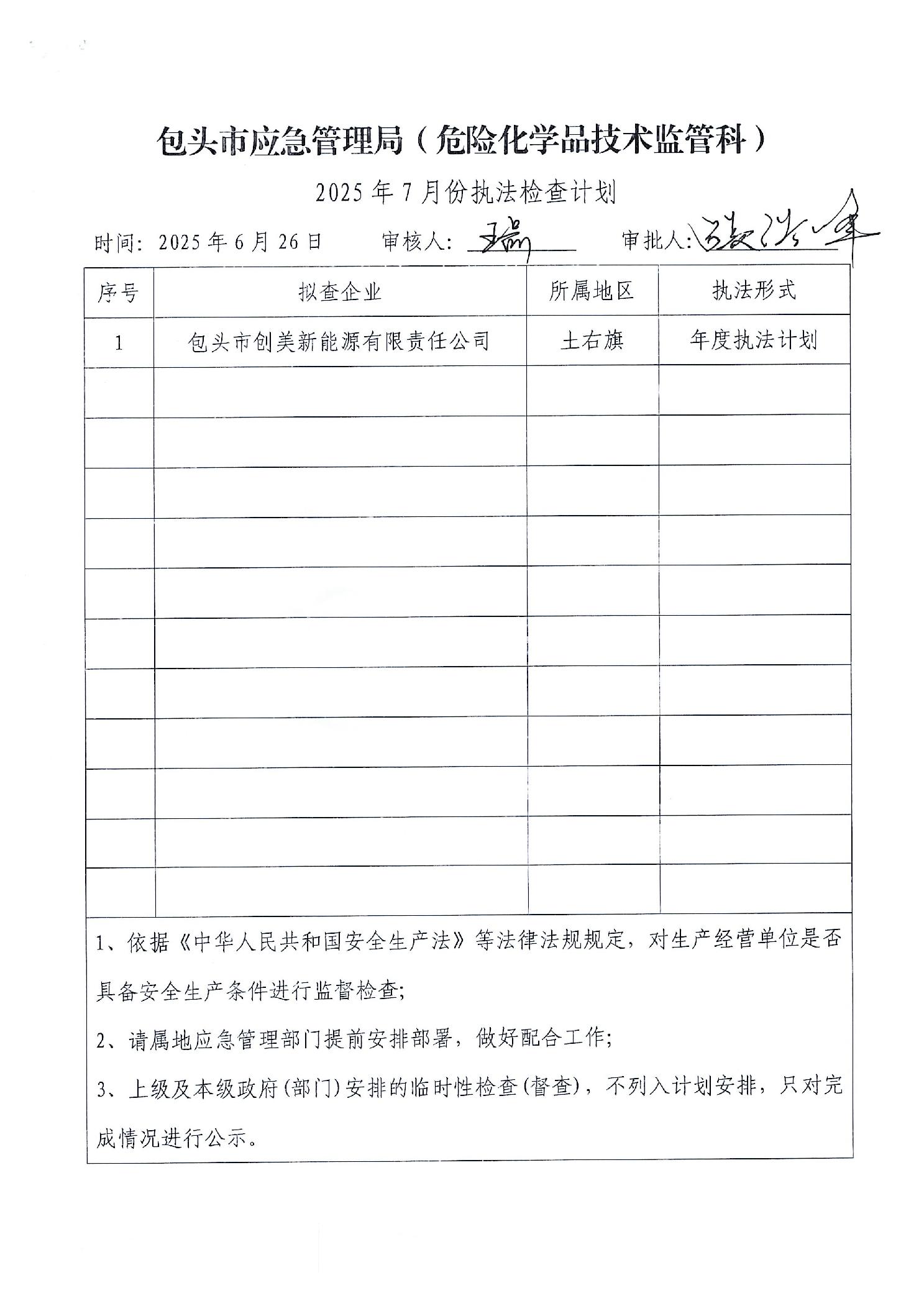 包头市应急管理局(危险化学品安全监管科、危险化学品技术监管科)2025年7月份执法检查计划