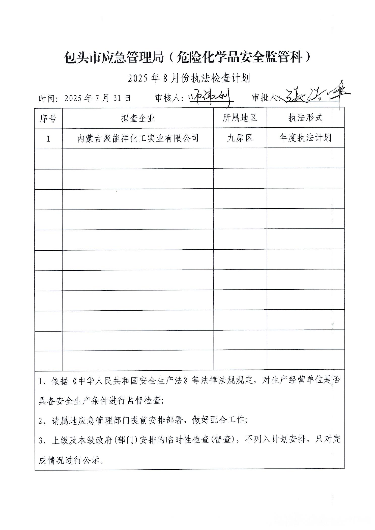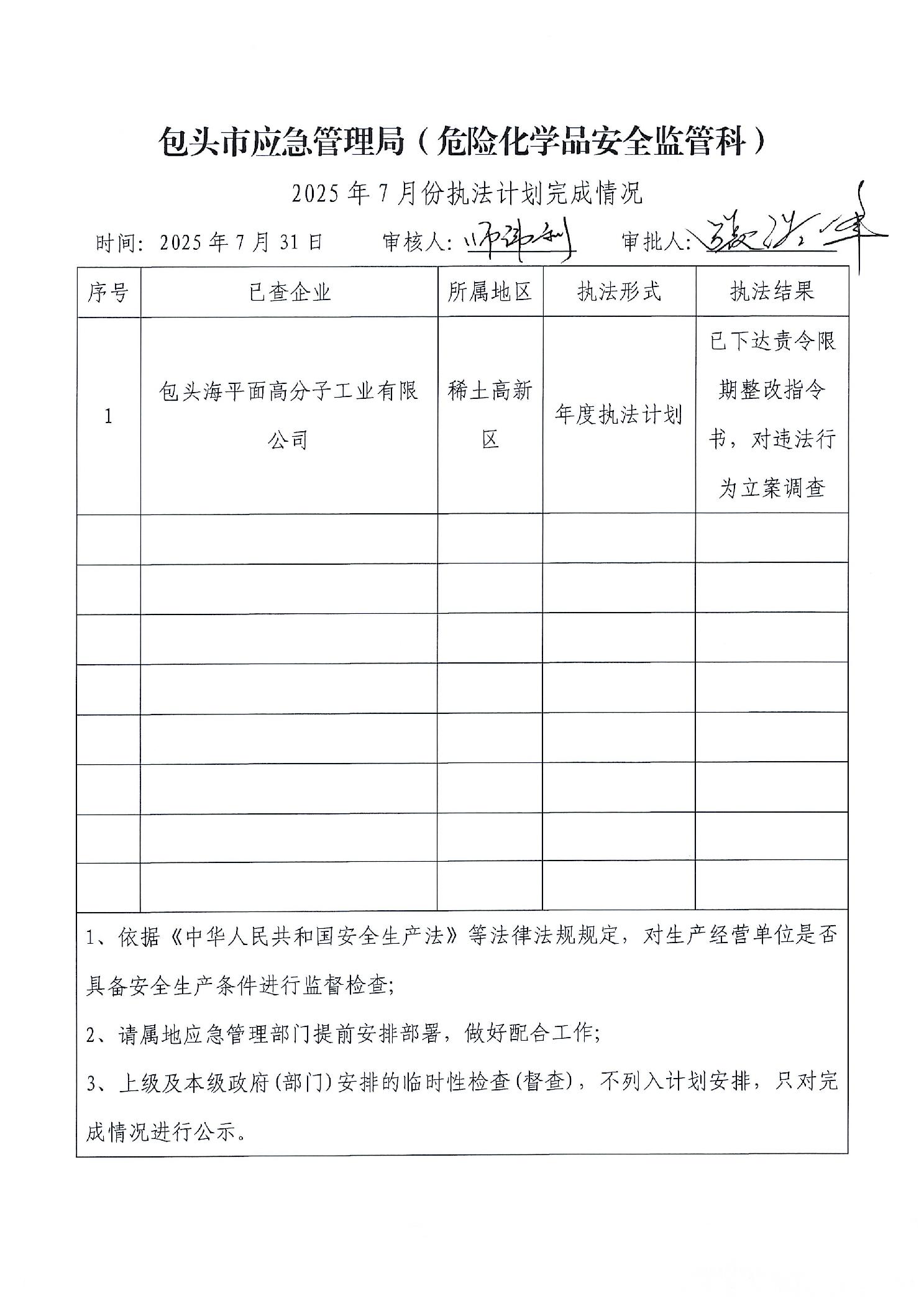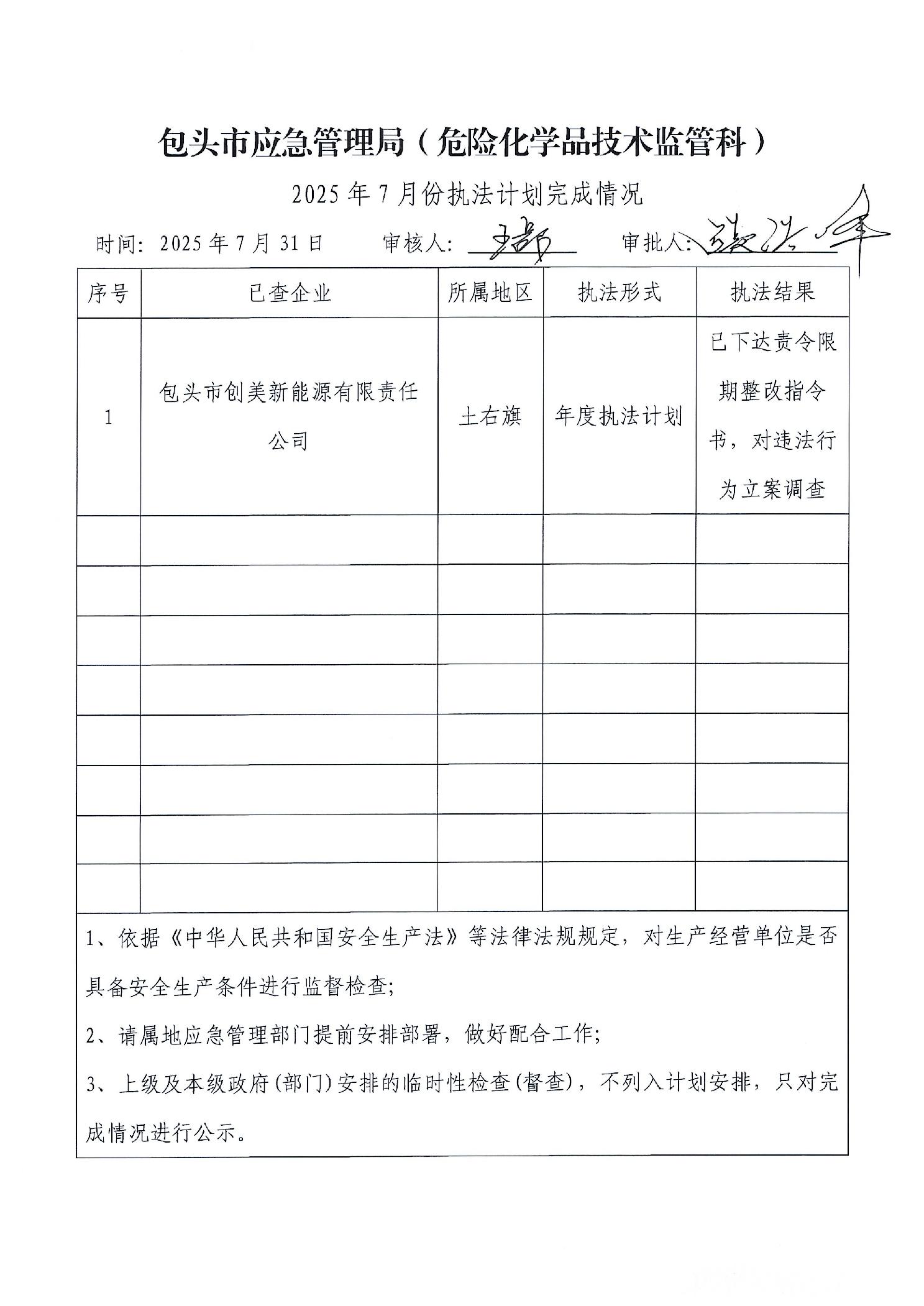 包头市应急管理局危化科2025年7月执法计划完成情况及8月份执法计划