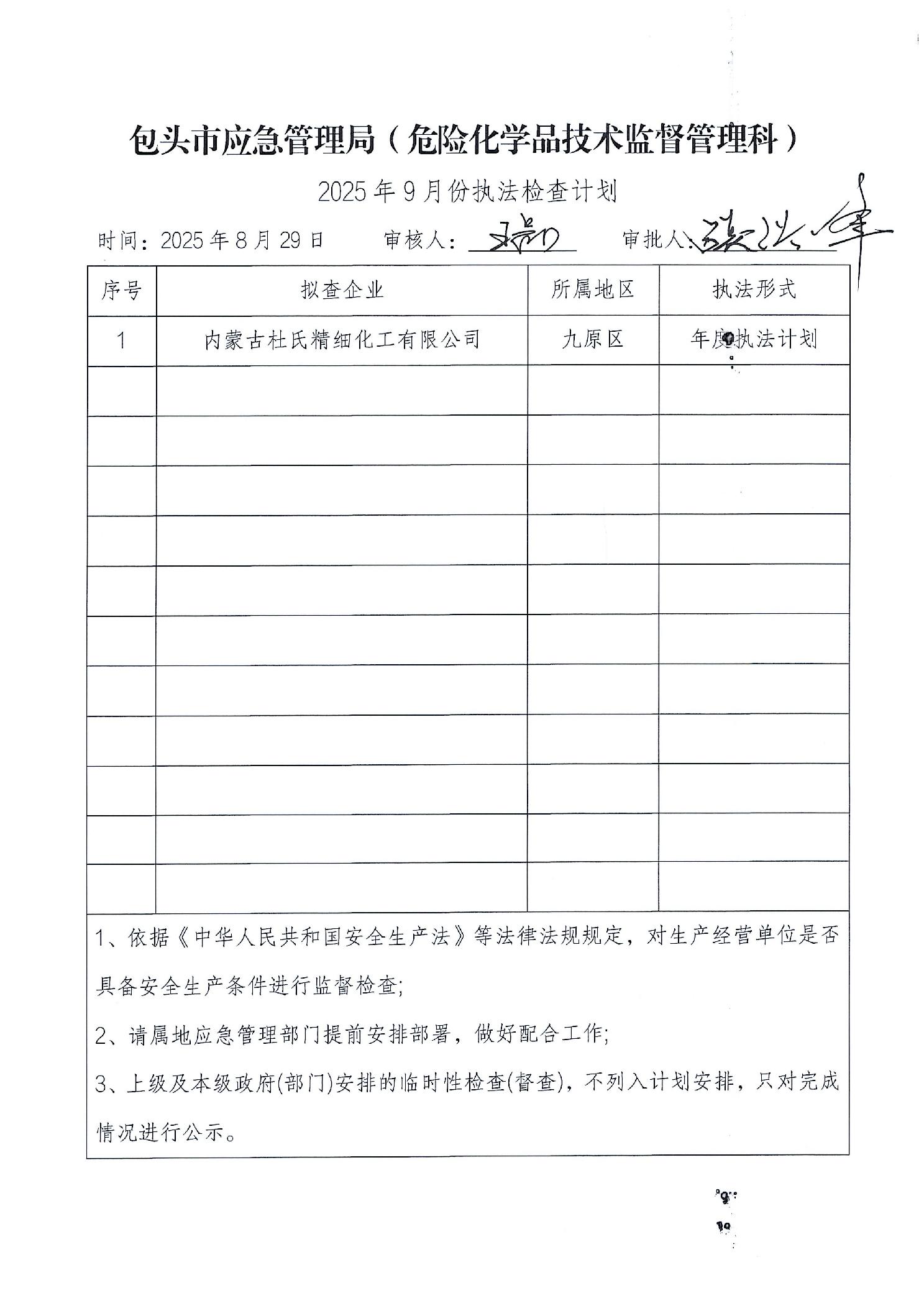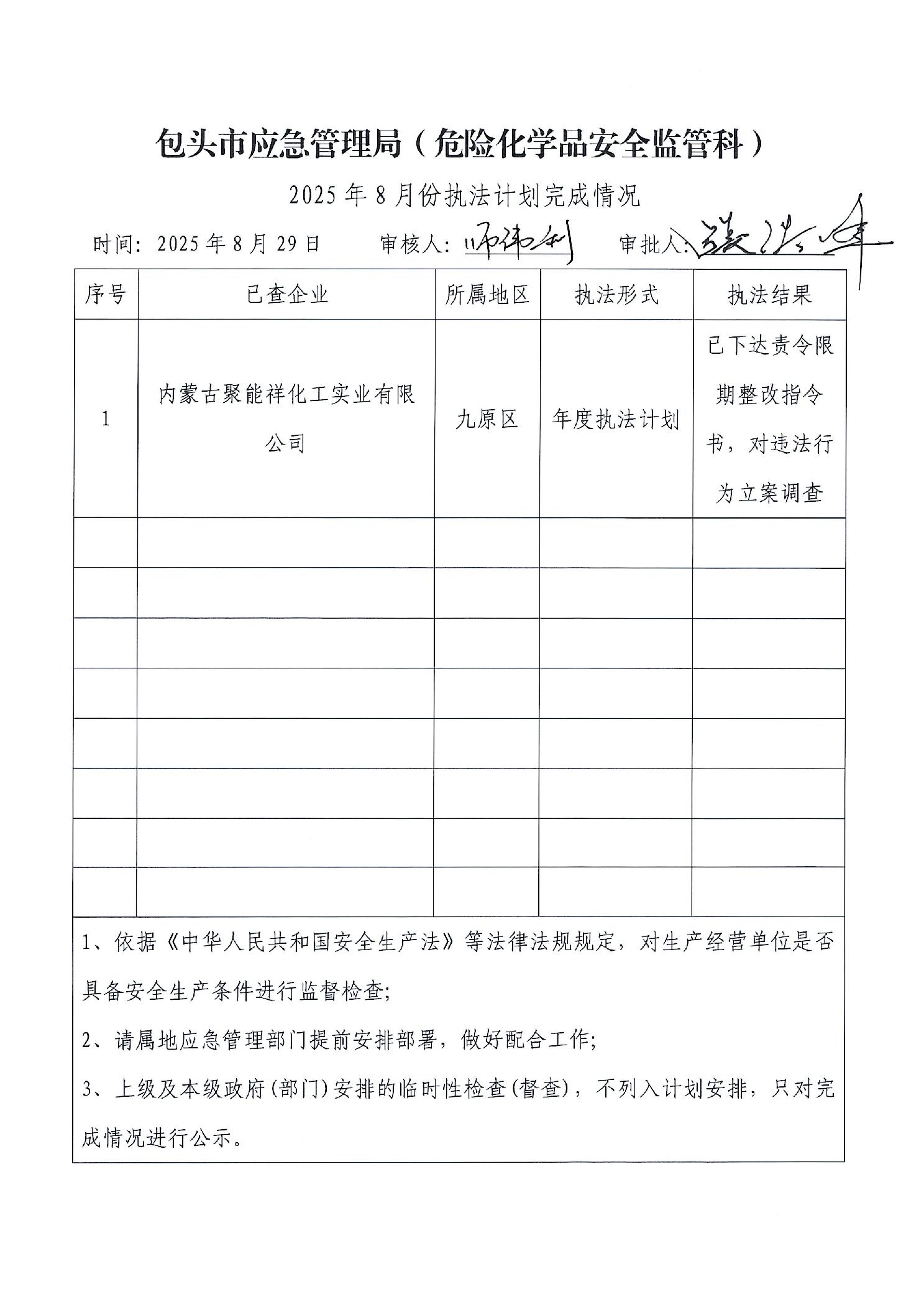 包头市应急管理局危化科2025年8月执法检查完成情况及2025年9月份执法检查安排公示