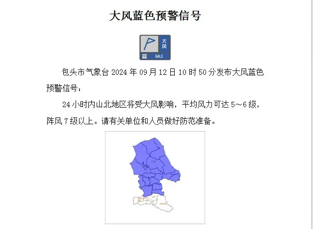 包头市气象台2024年09月12日10时50分发布大风蓝色预警,24小时内山北地区将受大风影响,平均风力可达5~6级,阵风7级以上。大风天气对于部分行业部门、生产经营单位正常运行和公众生活可能带来影响。包头市安全生产委员会办公室、包头市防灾减灾救灾指挥部办公室、包头市人工影响天气与气象灾害防御指挥部办公室提示:
