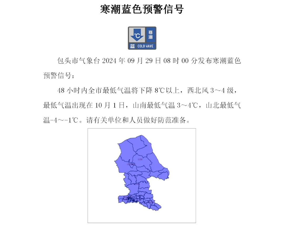 包头市气象台2024年09月29日08时发布寒潮蓝色预警,48小时内全市最低气温将下降8℃以上,西北风3~4级,最低气温出现在10月1日,山南最低气温3℃~4℃,山北最低气温-4~-1℃。此次寒潮过程对于部分行业部门、生产经营单位正常运行和公众生活可能带来较为严重的影响。包头市安全生产委员会办公室、包头市防灾减灾救灾指挥部办公室、包头市人工影响天气与气象灾害防御指挥部办公室提示: