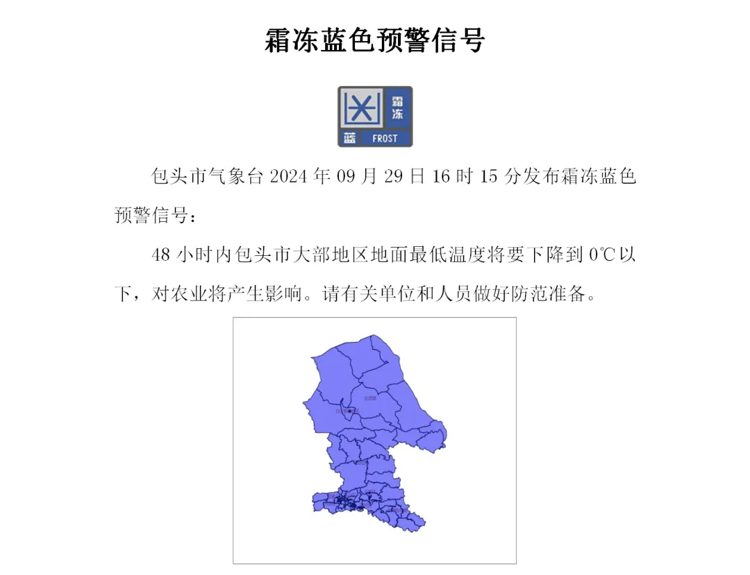 包头市气象台2024年09月29日16时15分发布霜冻蓝色预警,48小时内包头市大部地区地面最低温度将要下降到0℃以下,对农业将产生影响。此次霜冻过程对于部分行业部门、生产经营单位正常运行和公众生活可能带来较为严重的影响。包头市安全生产委员会办公室、包头市防灾减灾救灾指挥部办公室、包头市人工影响天气与气象灾害防御指挥部办公室提示: