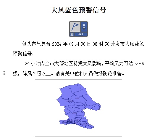 包头市气象台2024年09月30日08时50分发布大风蓝色预警,24小时内全市大部地区将受大风影响,平均风力可达5~6级,阵风7级以上。大风天气对于部分行业部门、生产经营单位正常运行和公众生活可能带来影响。包头市安全生产委员会办公室、包头市防灾减灾救灾指挥部办公室、包头市人工影响天气与气象灾害防御指挥部办公室提示: