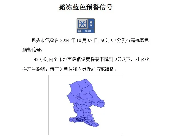 包头市气象台2024年10月09日09时发布霜冻蓝色预警,48小时内全市地面最低温度将要下降到0℃以下,对农业将产生影响。此次霜冻过程对于部分行业部门、生产经营单位正常运行和公众生活可能带来较为严重的影响。包头市安全生产委员会办公室、包头市防灾减灾救灾指挥部办公室、包头市人工影响天气与气象灾害防御指挥部办公室提示: