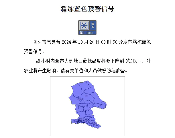包头市气象台2024年10月20日08时50分发布霜冻蓝色预警,48小时内全市大部地面最低温度将要下降到0℃以下,对农业将产生影响。此次霜冻过程对于部分行业部门、生产经营单位正常运行和公众生活可能带来较为严重的影响。包头市安全生产委员会办公室、包头市防灾减灾救灾指挥部办公室、包头市人工影响天气与气象灾害防御指挥部办公室提示: