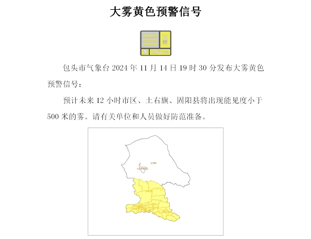 包头市气象台2024年11月14日19时30分发布大雾黄色预警,预计未来12小时市区、土右旗、固阳县将出现能见度小于500 米的雾。此次大雾过程对于部分行业部门、生产经营单位正常运行和公众生活可能带来较为严重的影响。包头市安全生产委员会办公室、包头市防灾减灾救灾指挥部办公室、包头市人工影响天气与气象灾害防御指挥部办公室提示: