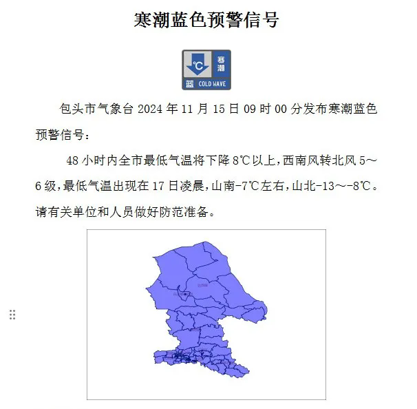 包头市气象台2024年11月15日09时发布寒潮蓝色预警,48小时内全市最低气温将下降8℃以上,西南风转北风5~6级,最低气温出现在17日凌晨,山南-7℃左右,山北-13~-8℃。此次寒潮过程对于部分行业部门、生产经营单位正常运行和公众生活可能带来较为严重的影响。包头市安全生产委员会办公室、包头市防灾减灾救灾指挥部办公室、包头市人工影响天气与气象灾害防御指挥部办公室提示: