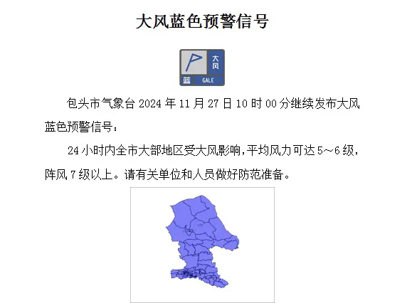 包头市气象台2024年11月27日10时继续发布大风蓝色预警 ,24小时内全市大部地区受大风影响,平均风力可达5~6级,阵风7级以上。大风天气对于部分行业部门、生产经营单位正常运行和公众生活可能带来影响。包头市安全生产委员会办公室、包头市防灾减灾救灾指挥部办公室、包头市森林草原防灭火指挥部办公室、包头市人工影响天气与气象灾害防御指挥部办公室提示: