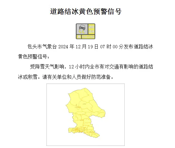包头市气象台2024年12月19日07时发布道路结冰黄色预警 ,受降雪天气影响,12小时内全市有对交通有影响的道路结冰或积雪。降雪和道路结冰对于部分行业部门、生产经营单位正常运行和公众生活可能带来影响。包头市安全生产委员会办公室、包头市防灾减灾救灾指挥部办公室、包头市人工影响天气与气象灾害防御指挥部办公室提示: