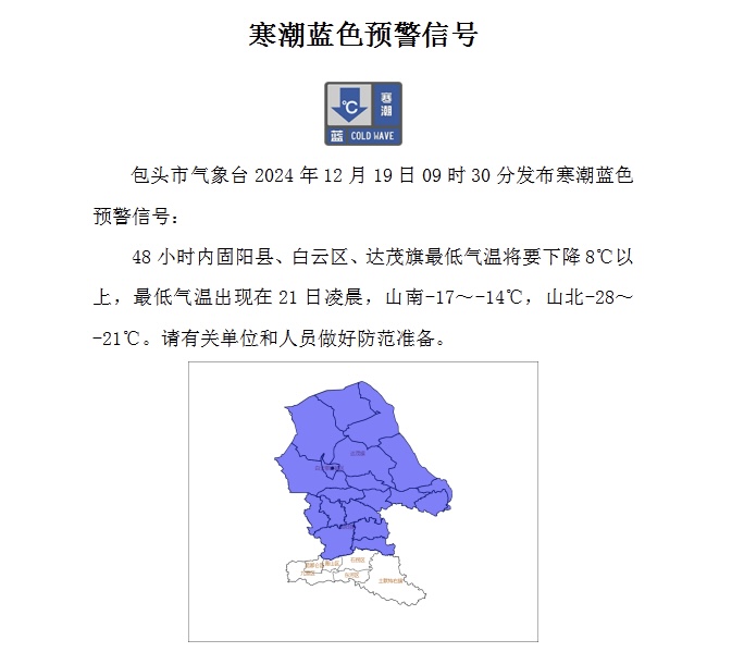 包头市气象台2024年12月19日09时30分发布寒潮蓝色预警 ,48小时内固阳县、白云区、达茂旗最低气温将要下降8℃以上,最低气温出现在21日凌晨,山南-17~-14℃,山北-28~-21℃。此次寒潮过程对于部分行业部门、生产经营单位正常运行和公众生活可能带来较为严重的影响。包头市安全生产委员会办公室、包头市防灾减灾救灾指挥部办公室、包头市人工影响天气与气象灾害防御指挥部办公室提示: