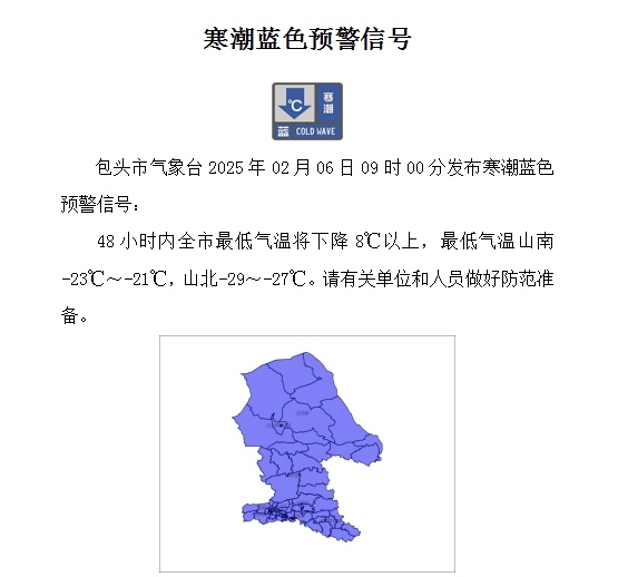 包头市气象台2025年02月06日09时 发布寒潮蓝色预警 ,48小时内全市最低气温将下降8℃以上,最低气温山南 -23℃~-21℃,北-29~-27℃。此次寒潮过程对于部分行业部门、生产经营单位正常运行和公众生活可能带来较为严重的影响。包头市安全生产委员会办公室、包头市防灾减灾救灾指挥部办公室、包头市人工影响天气与气象灾害防御指挥部办公室提示: