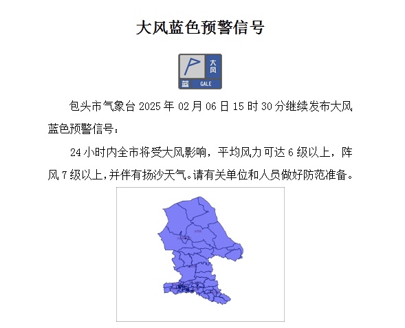 包头市气象台2025年02月06日15时30分继续发布大风蓝色预警 ,24小时内全市将受大风影响,平均风力可达6级以上,阵风7级以上,并伴有扬沙天气。大风天气对于部分行业部门、生产经营单位正常运行和公众生活可能带来影响。包头市安全生产委员会办公室、包头市防灾减灾救灾指挥部办公室、包头市森林草原防灭火指挥部办公室、包头市人工影响天气与气象灾害防御指挥部办公室提示:
