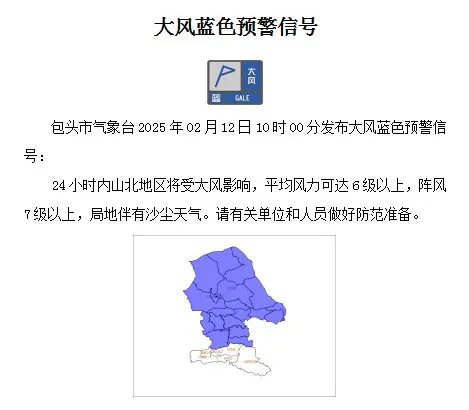 包头市气象台2025年02月12日10时发布大风蓝色预警,24小时内山北地区将受大风影响,平均风力可达6级以上,阵风7级以上,局地伴有沙尘天气。大风天气对于部分行业部门、生产经营单位正常运行和公众生活可能带来影响。包头市安全生产委员会办公室、包头市防灾减灾救灾指挥部办公室、包头市森林草原防灭火指挥部办公室、包头市人工影响天气与气象灾害防御指挥部办公室提示: