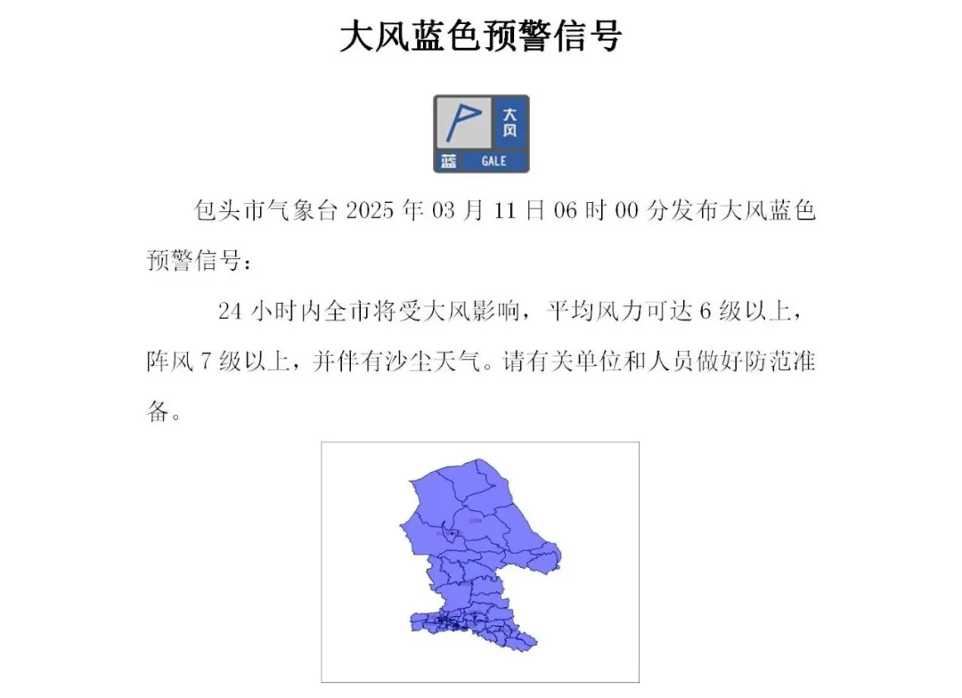 包头市气象台2025年03月11日06时发布大风蓝色预警 ,24小时内全市将受大风影响,平均风力可达6级以上,阵风7级以上,并伴有沙尘天气。大风天气对于部分行业部门、生产经营单位正常运行和公众生活可能带来影响。包头市安全生产委员会办公室、包头市防灾减灾救灾指挥部办公室、包头市森林草原防灭火指挥部办公室、包头市人工影响天气与气象灾害防御指挥部办公室提示: