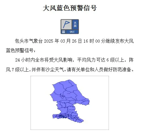 包头市气象台2025年03月26日16时 继续发布大风蓝色预警 ,24小时内全市将受大风影响,平均风力可达6级以上,阵风7级以上,并伴有沙尘天气。大风天气对于部分行业部门、生产经营单位正常运行和公众生活可能带来影响。包头市安全生产委员会办公室、包头市防灾减灾救灾委员会办公室、包头市森林草原防灭火指挥部办公室、包头市人工影响天气与气象灾害防御指挥部办公室提示: