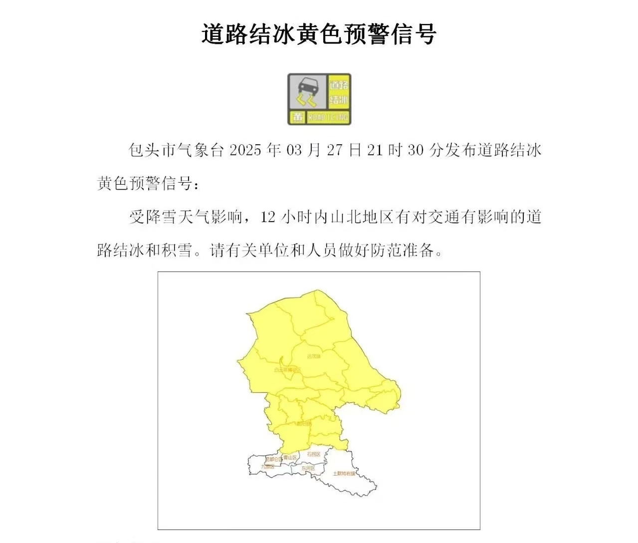 包头市气象台2025年03月27日21时30分发布道路结冰黄色预警,受降雪天气影响,12小时内山北地区有对交通有影响的道路结冰和积雪。降雪和道路结冰对于部分行业部门、生产经营单位正常运行和公众生活可能带来影响。包头市安全生产委员会办公室、包头市防灾减灾救灾委员会办公室、包头市人工影响天气与气象灾害防御指挥部办公室提示: