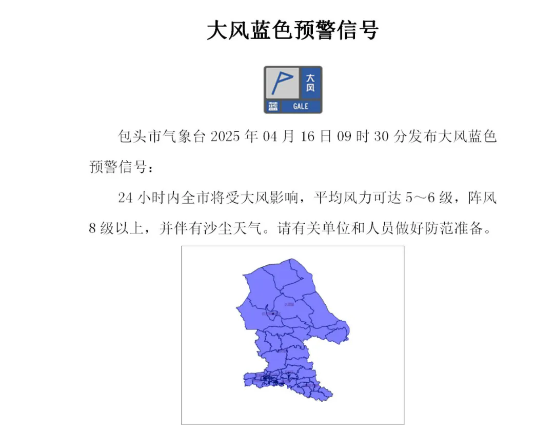 包头市气象台2025年04月16日09时30分发布大风蓝色预警,24小时内全市将受大风影响,平均风力可达5~6级,阵风8级以上,并伴有沙尘天气。大风天气对于部分行业部门、生产经营单位正常运行和公众生活可能带来影响。包头市安全生产委员会办公室、包头市防灾减灾救灾委员会办公室、包头市森林草原防灭火指挥部办公室、包头市人工影响天气与气象灾害防御指挥部办公室提示: