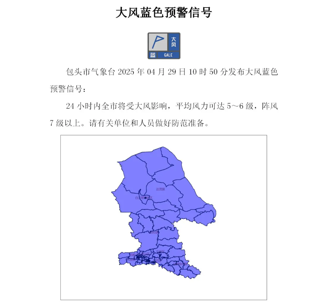 包头市气象台2025年04月29日10时50分发布大风蓝色预警,24小时内全市将受大风影响,平均风力可达5~6级,阵风7级以上。大风天气对于部分行业部门、生产经营单位正常运行和公众生活可能带来影响。包头市安全生产委员会办公室、包头市防灾减灾救灾委员会办公室、包头市森林草原防灭火指挥部办公室、包头市人工影响天气与气象灾害防御指挥部办公室提示: