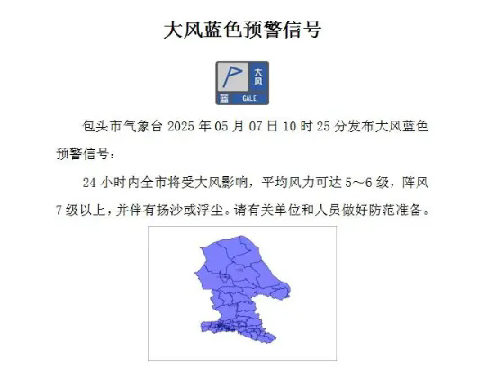 包头市气象台2025年05月07日10时25分发布大风蓝色预警,24小时内全市将受大风影响,平均风力可达5~6级,阵风7级以上,并伴有扬沙或浮尘。大风天气对于部分行业部门、生产经营单位正常运行和公众生活可能带来影响。包头市安全生产委员会办公室、包头市防灾减灾救灾委员会办公室、包头市森林草原防灭火指挥部办公室、包头市人工影响天气与气象灾害防御指挥部办公室提示: